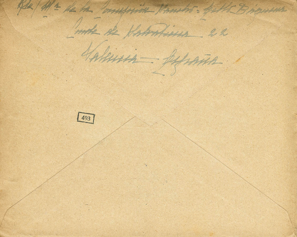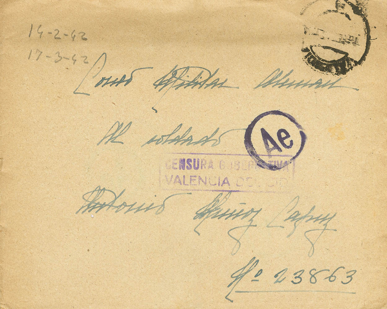 1942. Carta (con texto) de VALENCIA a FELDPOST Nº23863 (Regimiento de ArtillerÃa 250, BaterÃa P.M.). En el frente marca AE, en violeta. MAGNIFICA.
