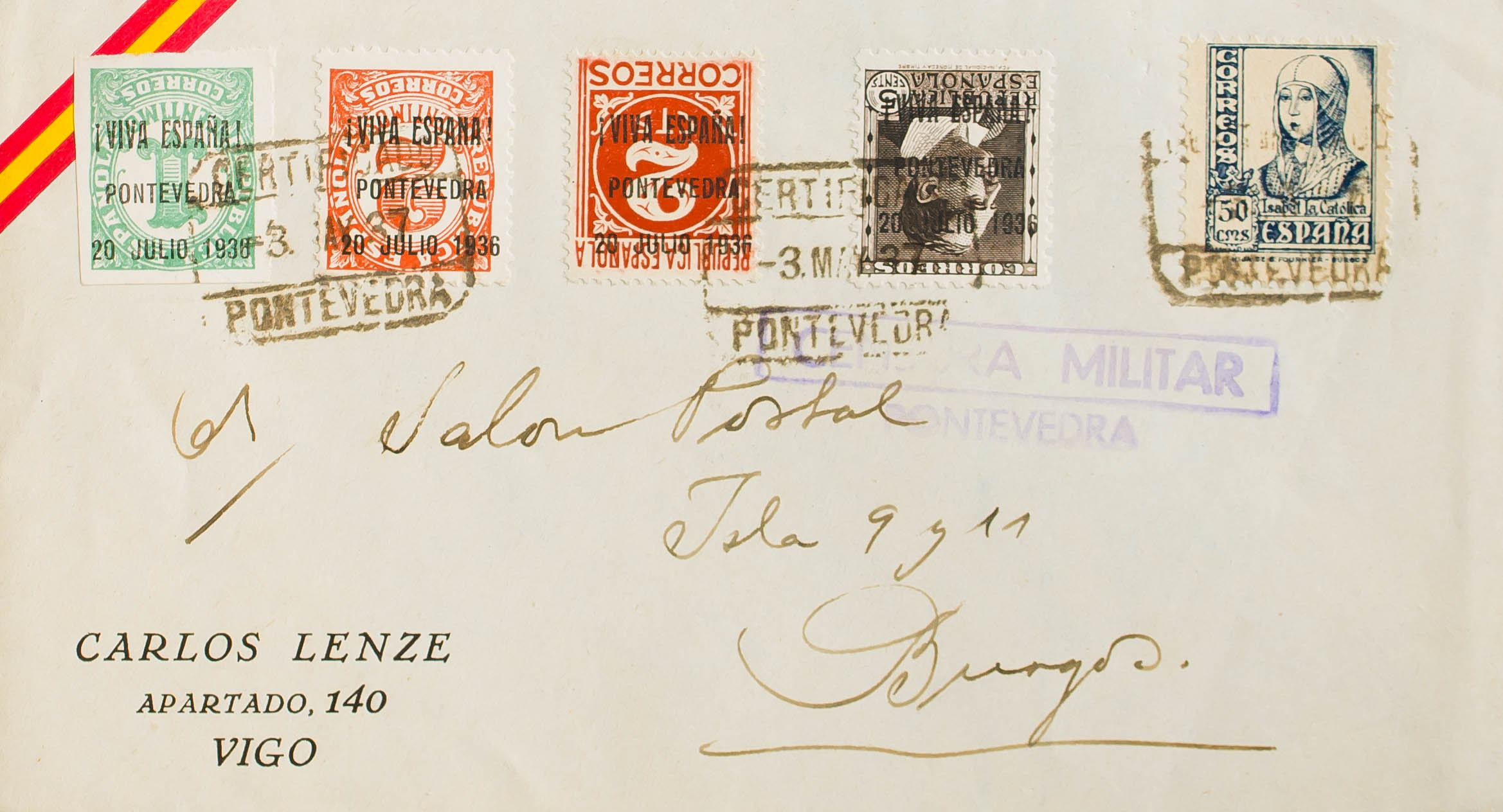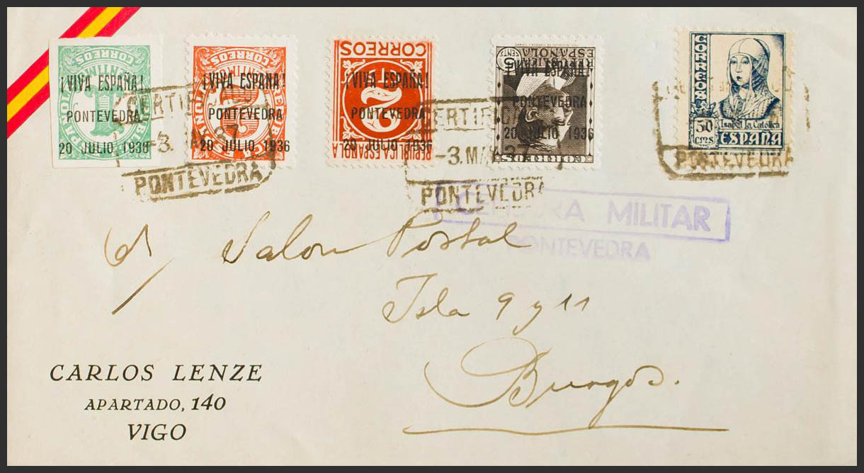 2hi, 3hi, 5hi, 6hi. 1937. 1 cts, 2 cts castaño claro, 2 cts castaño rojo, 5 cts castaño negro SOBRECARGAS INVERTIDAS y 50 cts azul. Certificado de PONTEVEDRA a BURGOS. MAGNIFICA Y RARA.