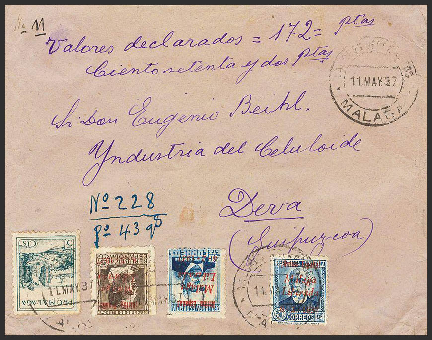 1937. Diversos valores. MALAGA a DEVA. Al dorso llegada, verdaderamente circulada. MAGNIFICA.