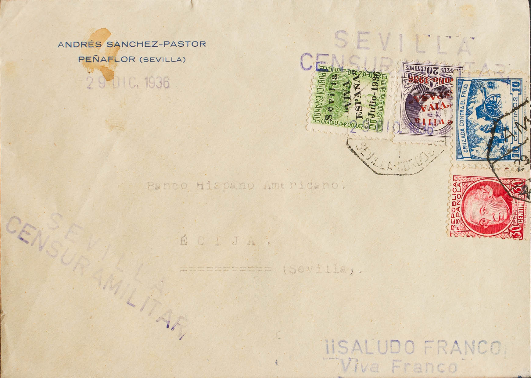 4, 6. 1936. 10 cts, 20 cts y 10 cts, CRUZADA CONTRA EL FRIO. PEÑAFLOR a ECIJA. Matasello AMB / FERROCARRIL / SEVILLA-CORDOBA. MAGNIFICA.