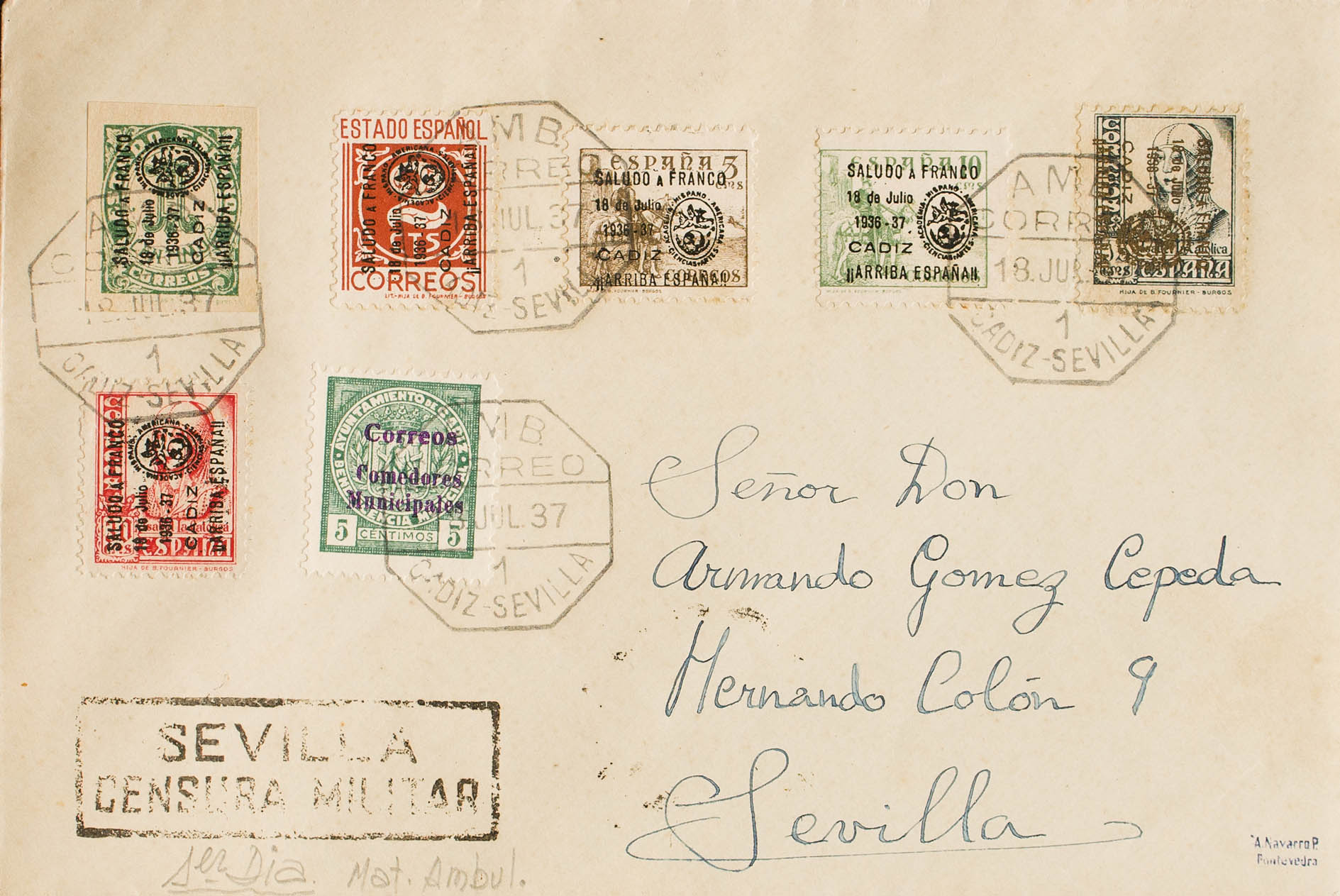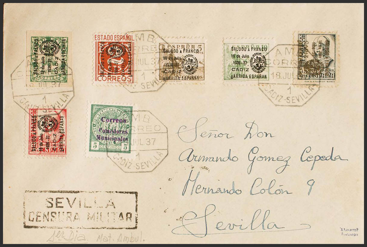 11/16. 1937. Serie completa. CADIZ a SEVILLA. Al dorso llegada. MAGNIFICA Y RARA.