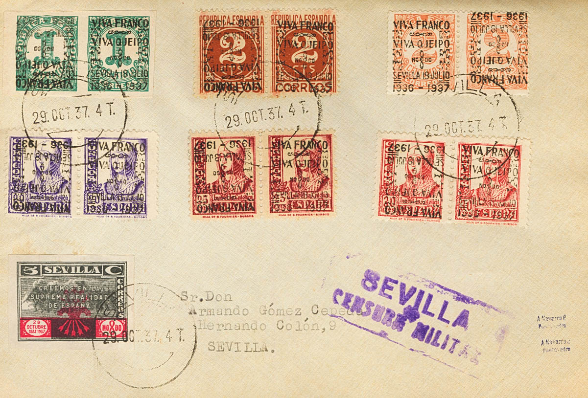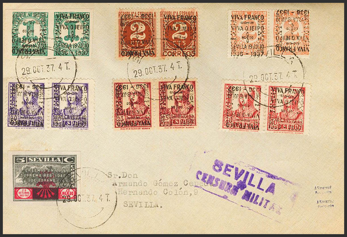 69/79hphi. 1937. Serie completa (once valores), en pareja con UN SELLO SOBRECARGA INVERTIDA sobre dos cartas filatélicas dirigidas a SEVILLA. MAGNIFICA Y RARA.