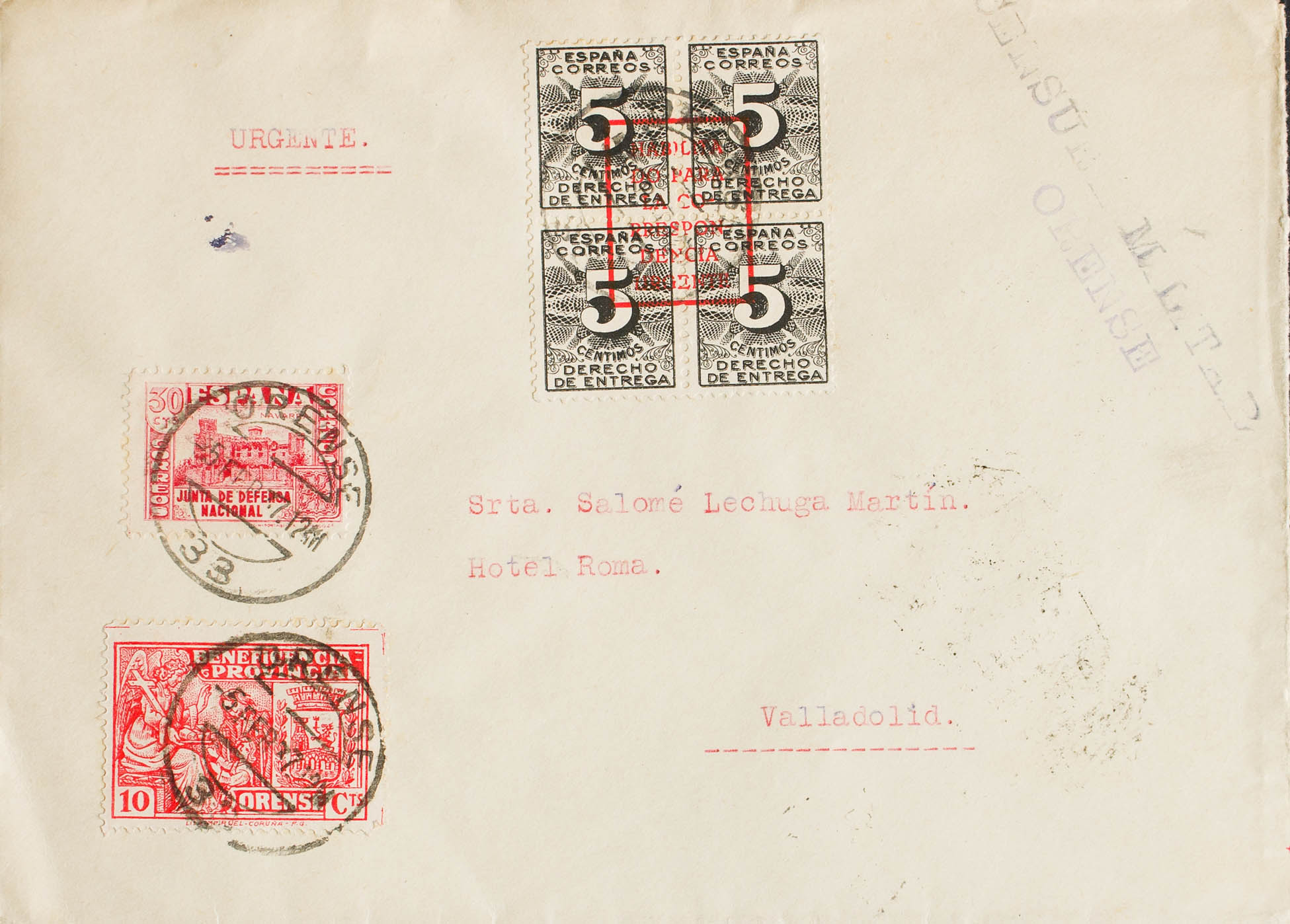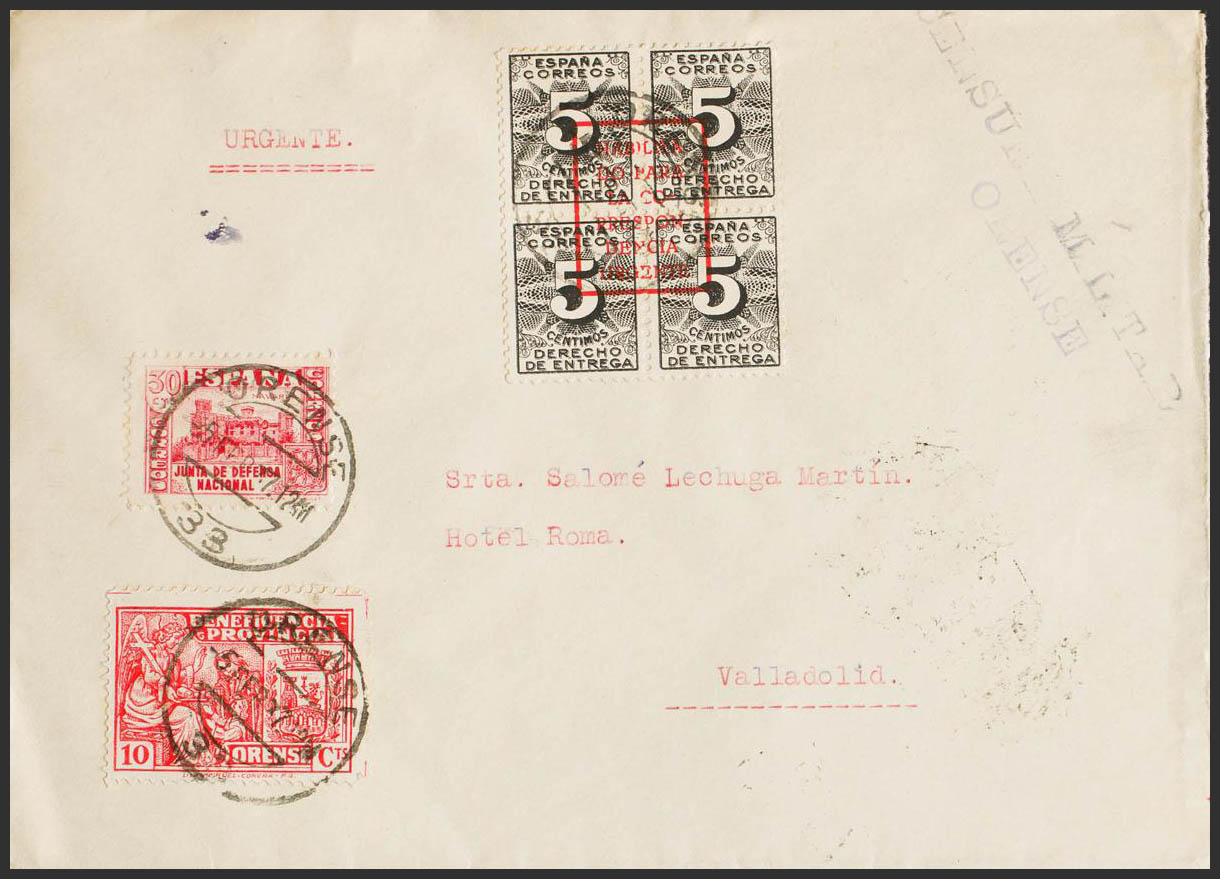 23. 1937. 5 cts negro (bloque de cuatro ELP Burgos), 30 cts rosa y Benéfico de 10 cts rojo. ORENSE a VALLADOLID. Al dorso llegada. MAGNIFICA Y RARA.