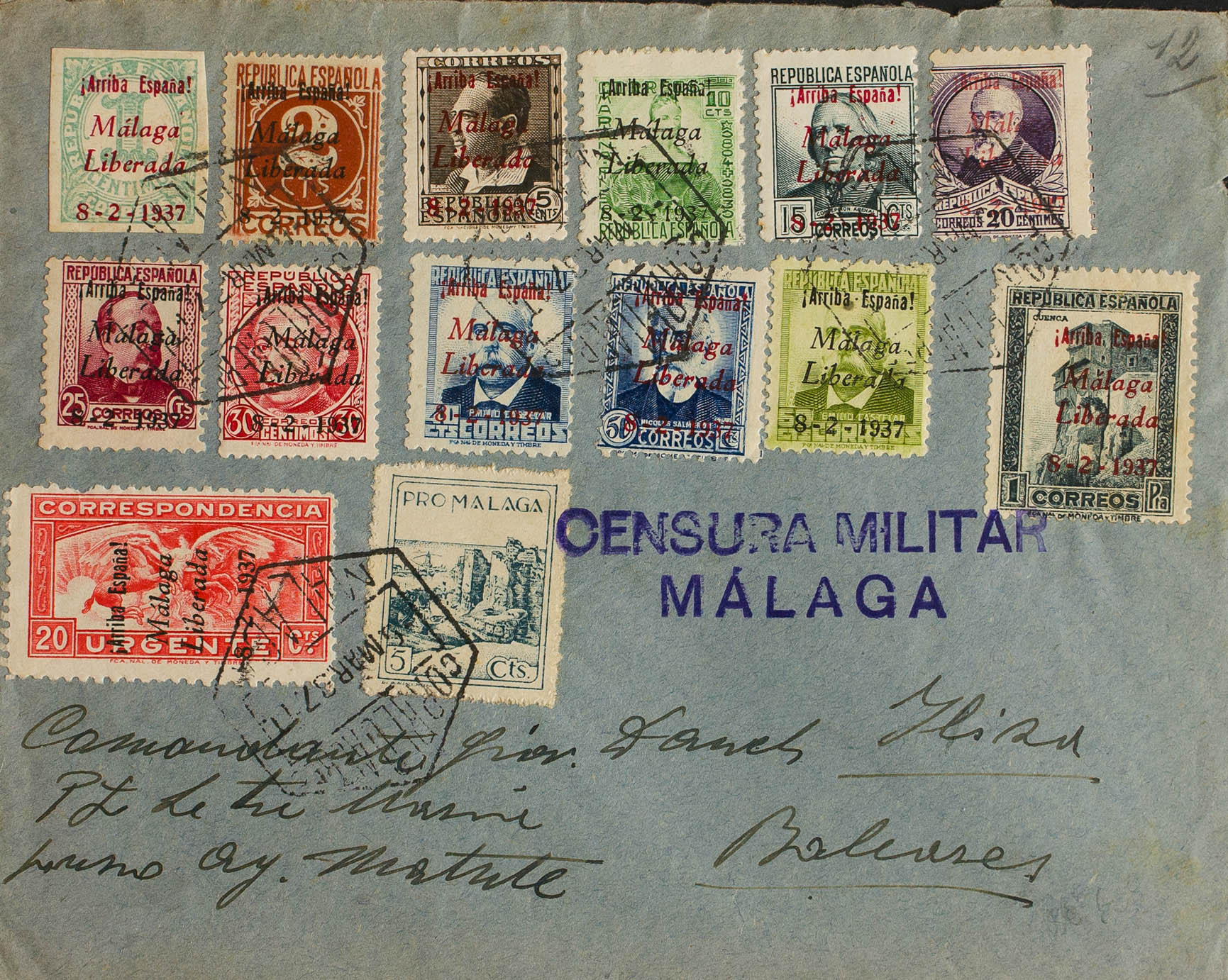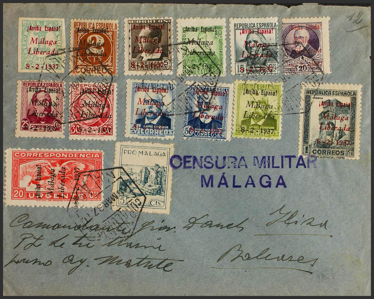 12, 14/15, 17/18, 20/24. 1937. Diversos valores, alguno con variedad "Ñ" PEQUEÑA. MALAGA a IBIZA. Al dorso llegada. MAGNIFICA.