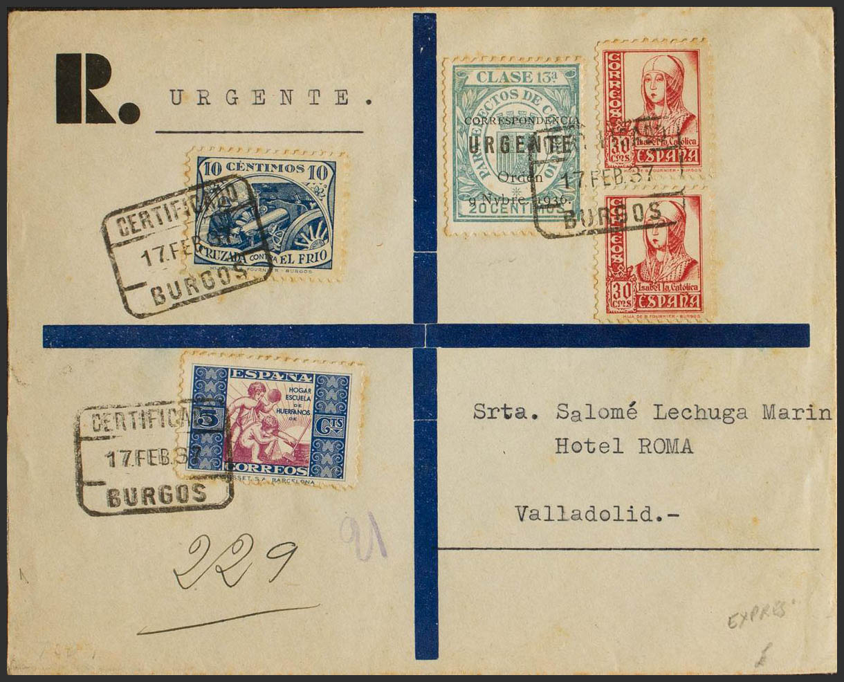 50. 1937. 20 cts verde, 30 cts rosa, dos sellos, 5 cts de Beneficencia y 10 cts de Cruzada Contra el Frío. Certificado de BURGOS a VALLADOLID. BONITA Y RARA.