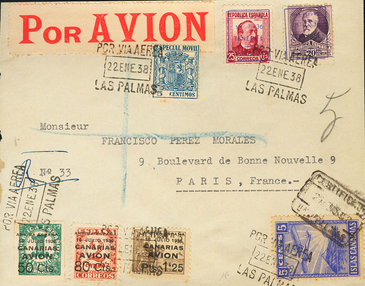 6, NE5. 1938. 20 cts violeta NO EMITIDO, 25 cts carmín y diversos valores. Certificado de LAS PALMAS a PARIS (FRANCIA). MAGNIFICO Y MUY RARO EL 20 CTS NO EMITIDO EN CARTA.