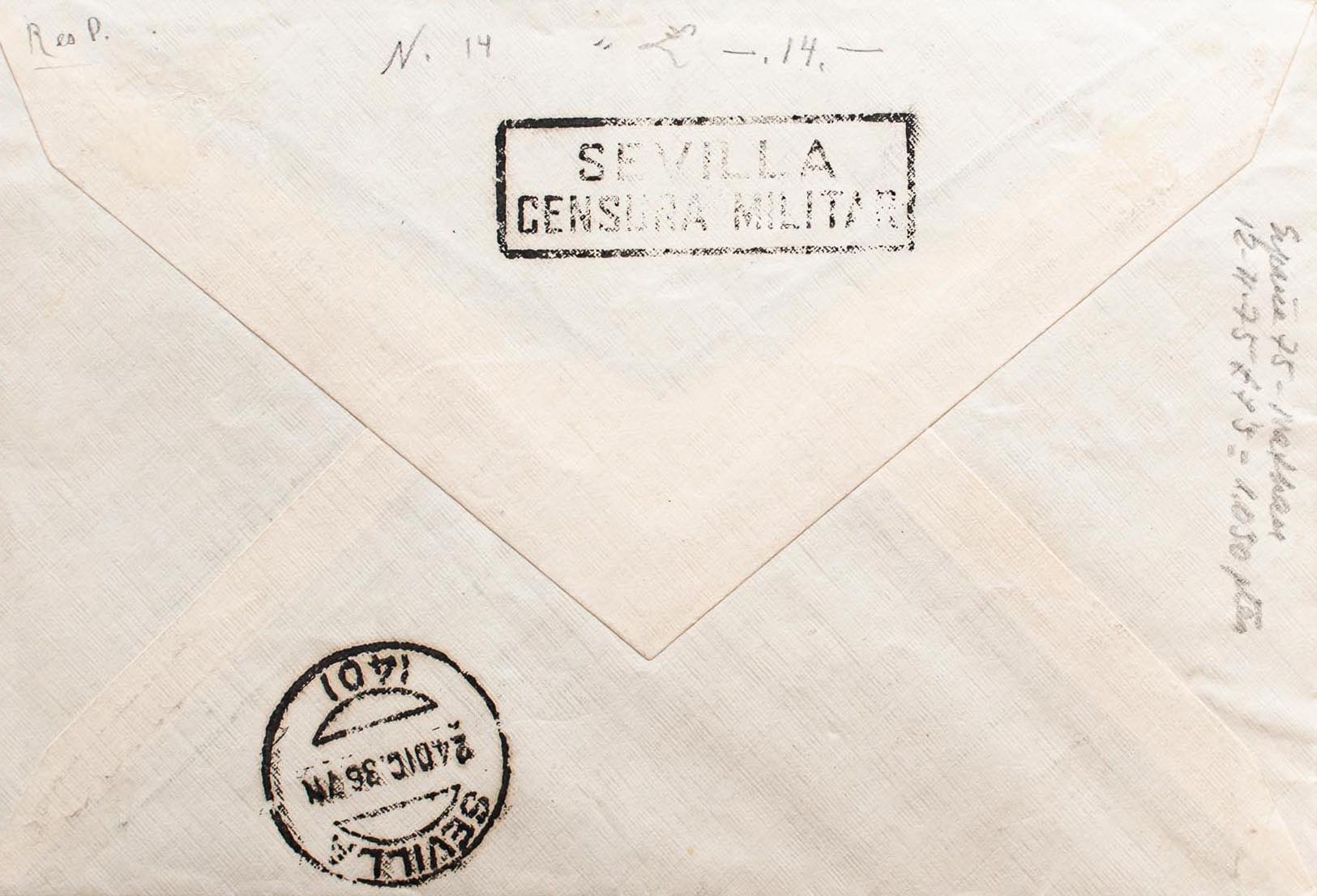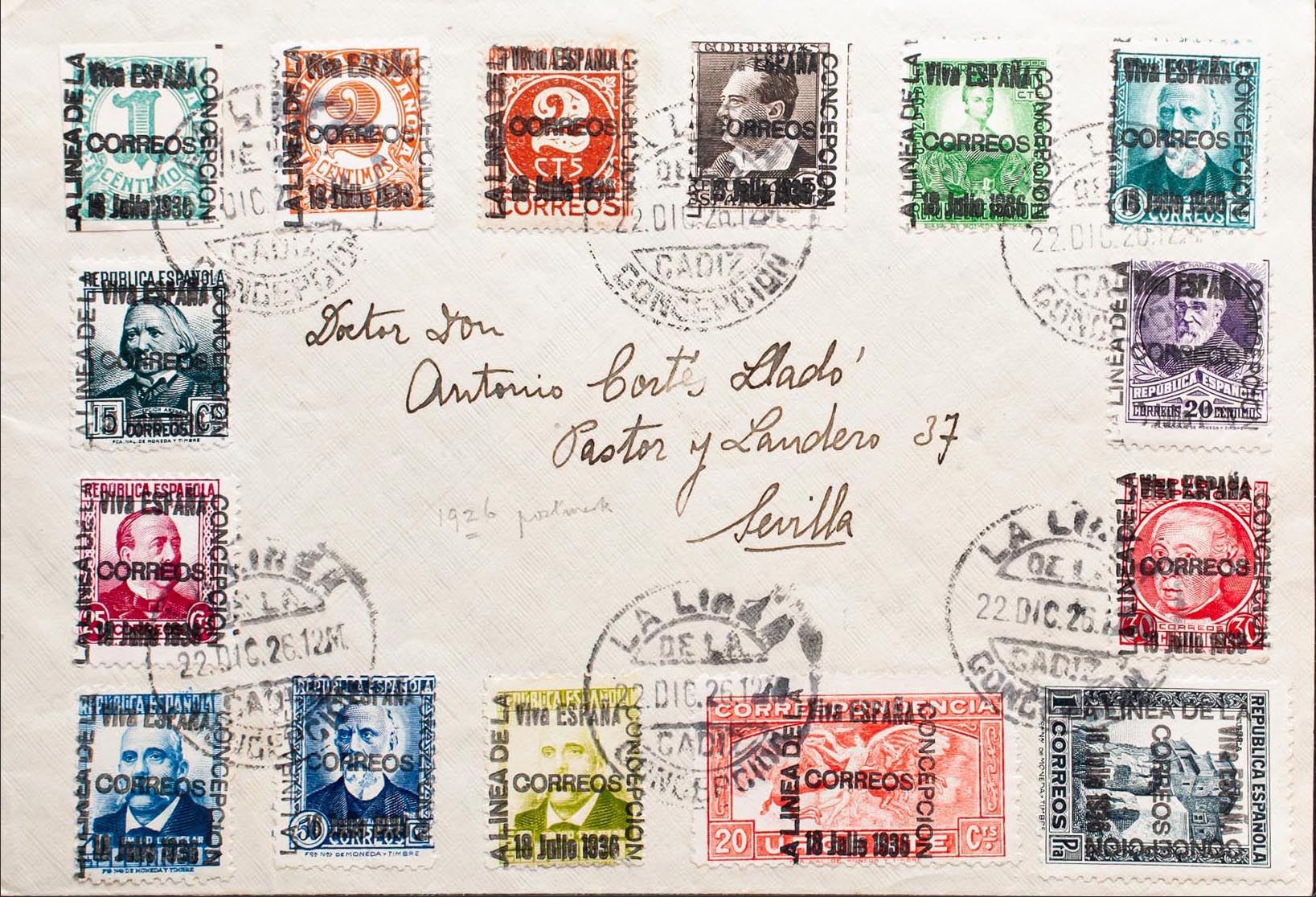 16/27, 30. 1936. Serie completa, a falta del 4 pts y 10 pts. LA LINEA DE LA CONCEPCION a SEVILLA. Al dorso llegada. MAGNIFICA.