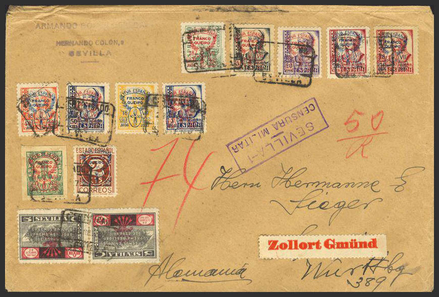 57/68. 1937. Serie completa, excepto el 5 cts y 5 cts negro TETE-BECHE. SEVILLA a ALEMANIA. Al dorso llegada. MAGNIFICA.
