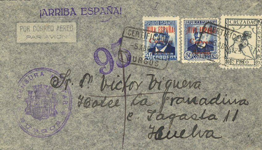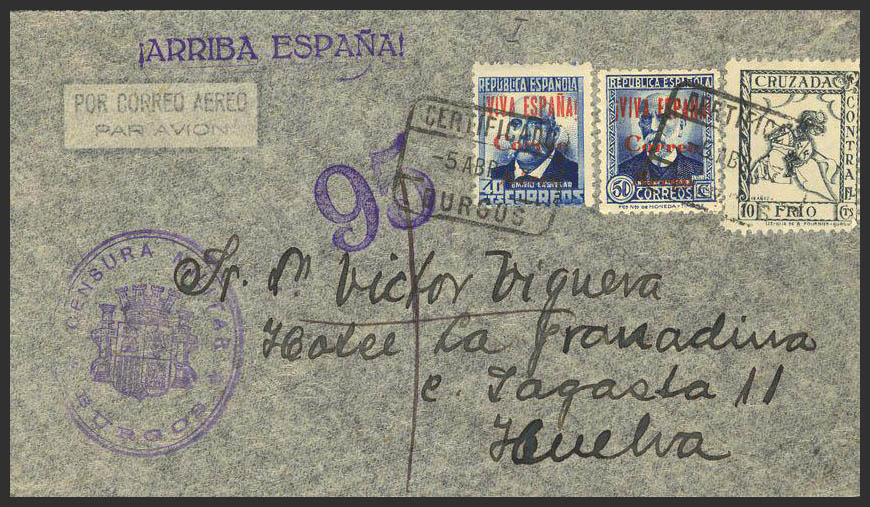 68/69. 1937. 40 cts, 50 cts y 10 cts CRUZADA CONTRA EL FRIO. Certificado de BURGOS a HUELVA. MAGNIFICA.
