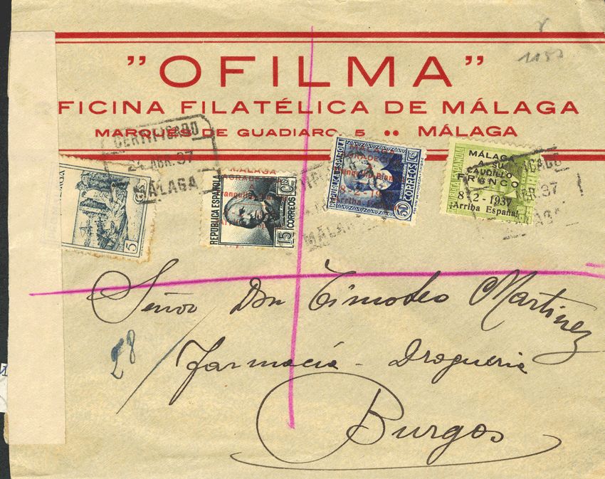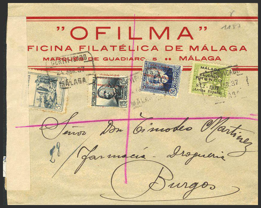 25, 27/28. 1937. 15 cts, 50 cts y 60 cts, 5 cts sello local MALAGA. MALAGA a BURGOS. MAGNIFICA.
