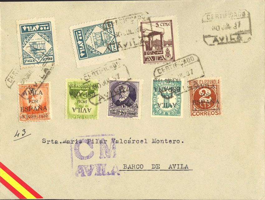 1/5. 1937. Serie completa y 5 cts, tres sellos locales AVILA. Certificado de AVILA a BARCO DE AVILA. Al dorso llegada. MAGNIFICO.