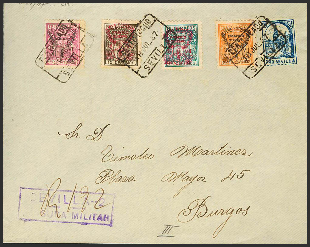 53/56. 1937. Serie completa. Certificado de SEVILLA a BURGOS. Al dorso llegada. MAGNIFICA.