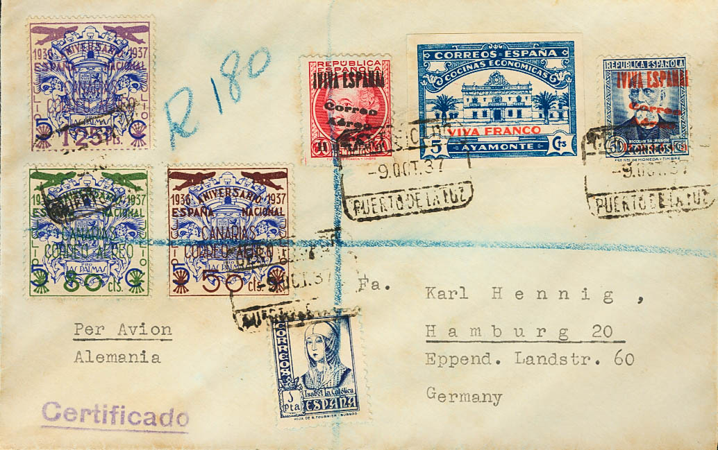 19, 20. 1937. Serie completa (Canarias) y 30 cts y 50 cts EMISIONES LOCALES PATRIOTICAS HUELVA. Certificado de PUERTO DE LA LUZ a HAMBURGO (ALEMANIA). Al dorso llegada. MAGNIFICA Y RARA.