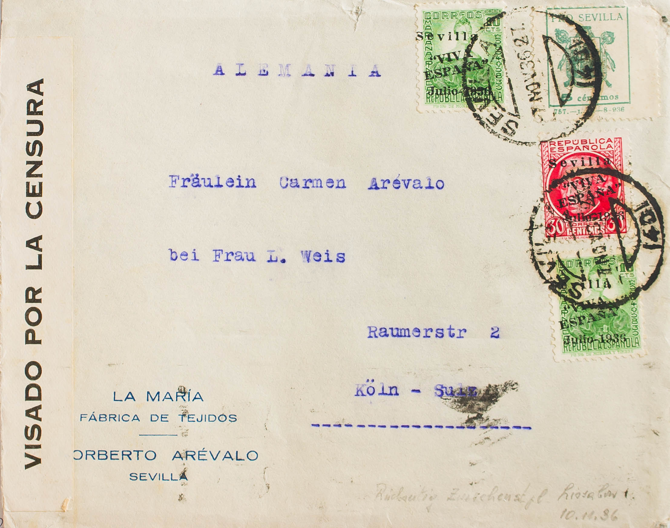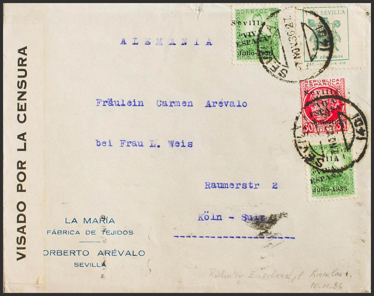 21(2), 25. 1936. 10 cts, dos sellos, 30 cts y 5 cts, sello local SEVILLA. SEVILLA a KÖLN (SUIZA). Al dorso llegada. MAGNIFICA.