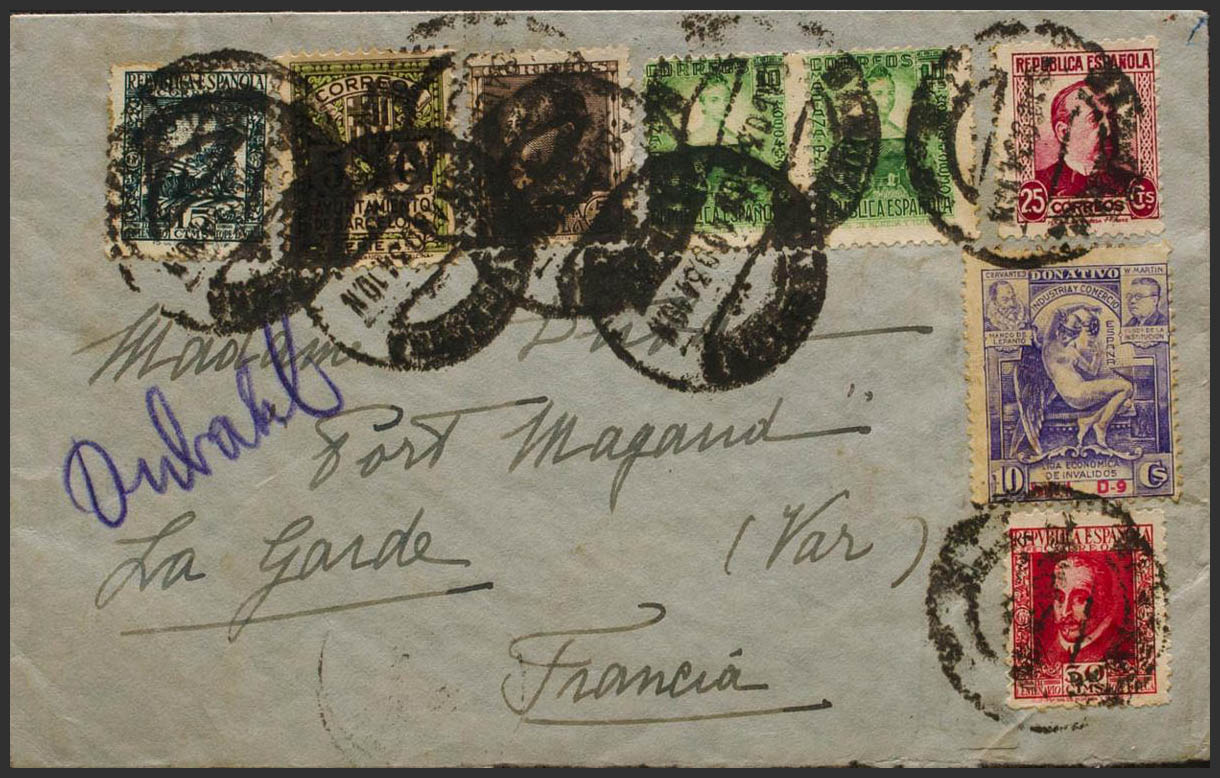 690, 691, 681, 682(2), 685. 1934. Diversos valores y Benéfico de 10 cts ultramar Liga Económica de Inválidos. BARCELONA a LA GARDE (FRANCIA). Al dorso llegada. MAGNIFICA E INUSUAL FRANQUEO.