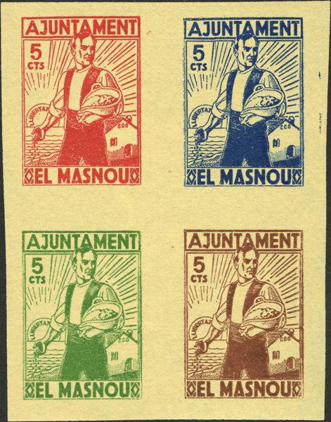 ★(1936ca). 5 cts, cuatro valores en hoja bloque. EL MASNOU. MAGNIFICA. (Guillamón 531).