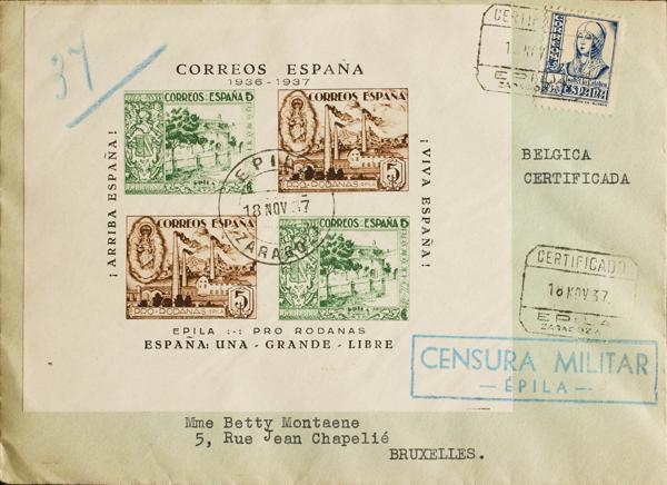 828. 1937. Hoja bloque EPILA 5 cts verde + 5 cts castaño y 1 pts azul. Certificado de EPILA a BRUSELAS (BELGICA) (dirección parcialmente recortada). Al dorso llegada. MAGNIFICA Y RARA. (Fesofi 5)