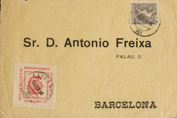 219. 1898. 15 cts castaño y Benéfico de 5 cts rojo SUSCRIPCION VOLUNTARIA / ALICANTE / VIVA ESPAÑA. ALICANTE a BARCELONA. Al dorso llegada. MAGNIFICA Y RARISIMA.