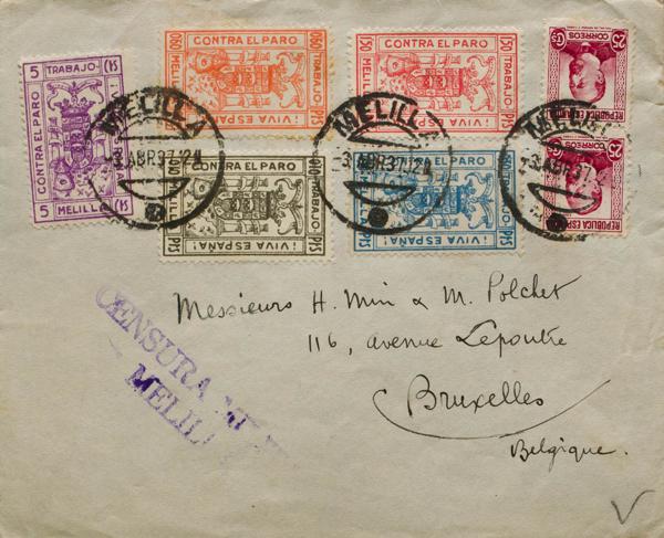 685(2). 1937. 25 cts carmÃn, dos sellos y benéficos de 5 cts, 10 cts, 30 cts, 60 cts y 12´50 pts de Melilla. MELILLA a BRUSELAS (BELGICA). MAGNIFICA.