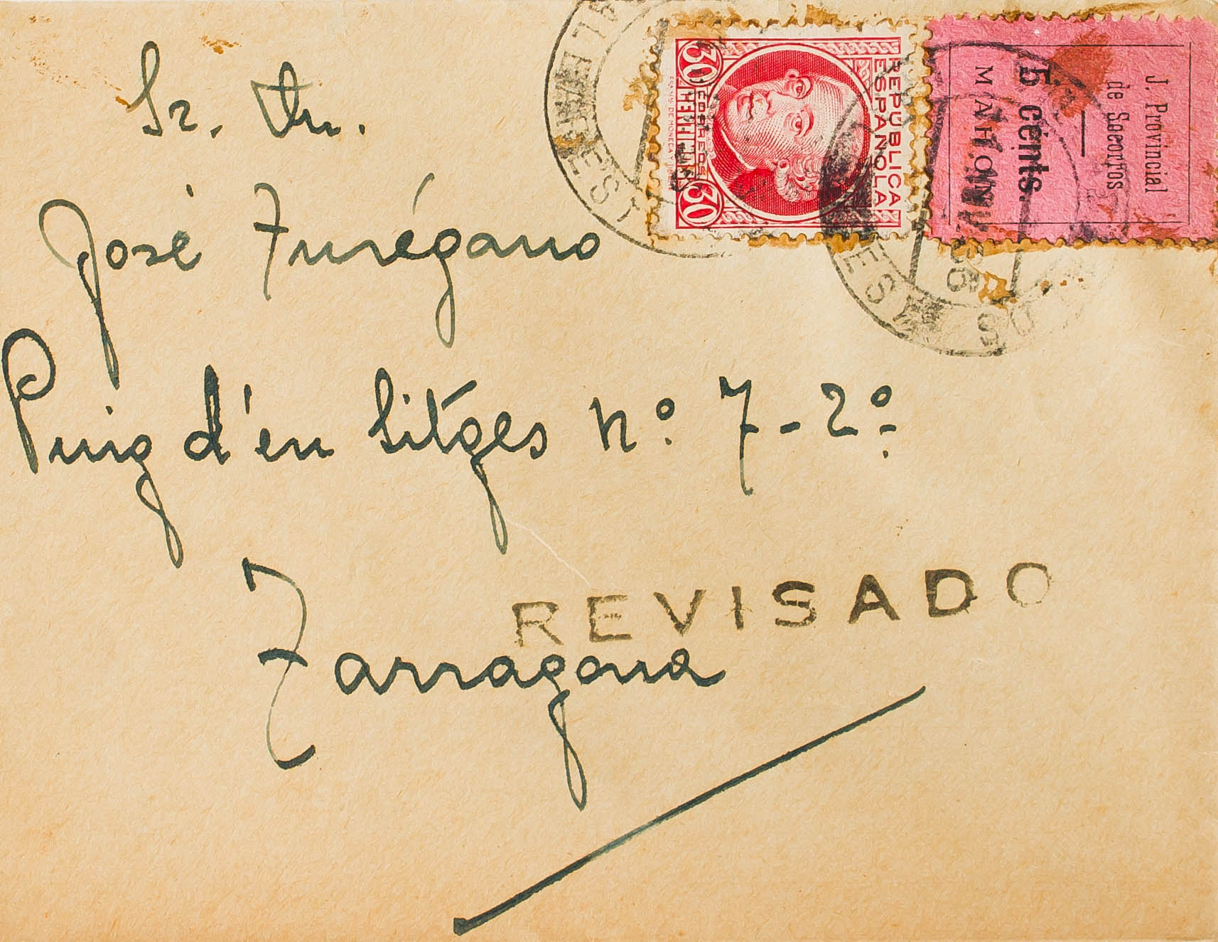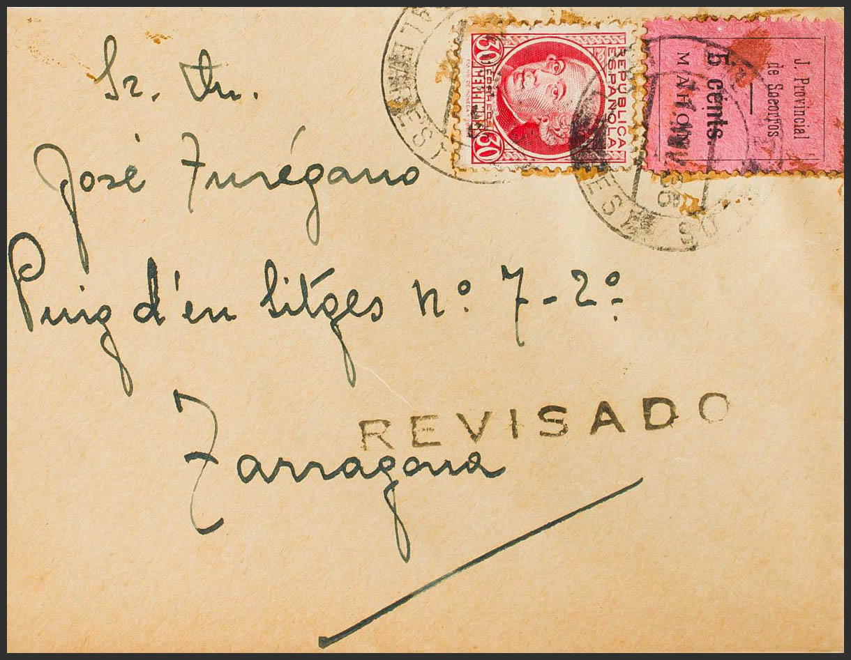 687. 1936. 30 cts carmÃn y 5 cts rosa (Tipo I) Local JUNTA PROVINCIAL DE SOCORROS / MAHON. VILLACARLOS a TARRAGONA. MAGNIFICA Y MUY RARA. (Fesofi 4)