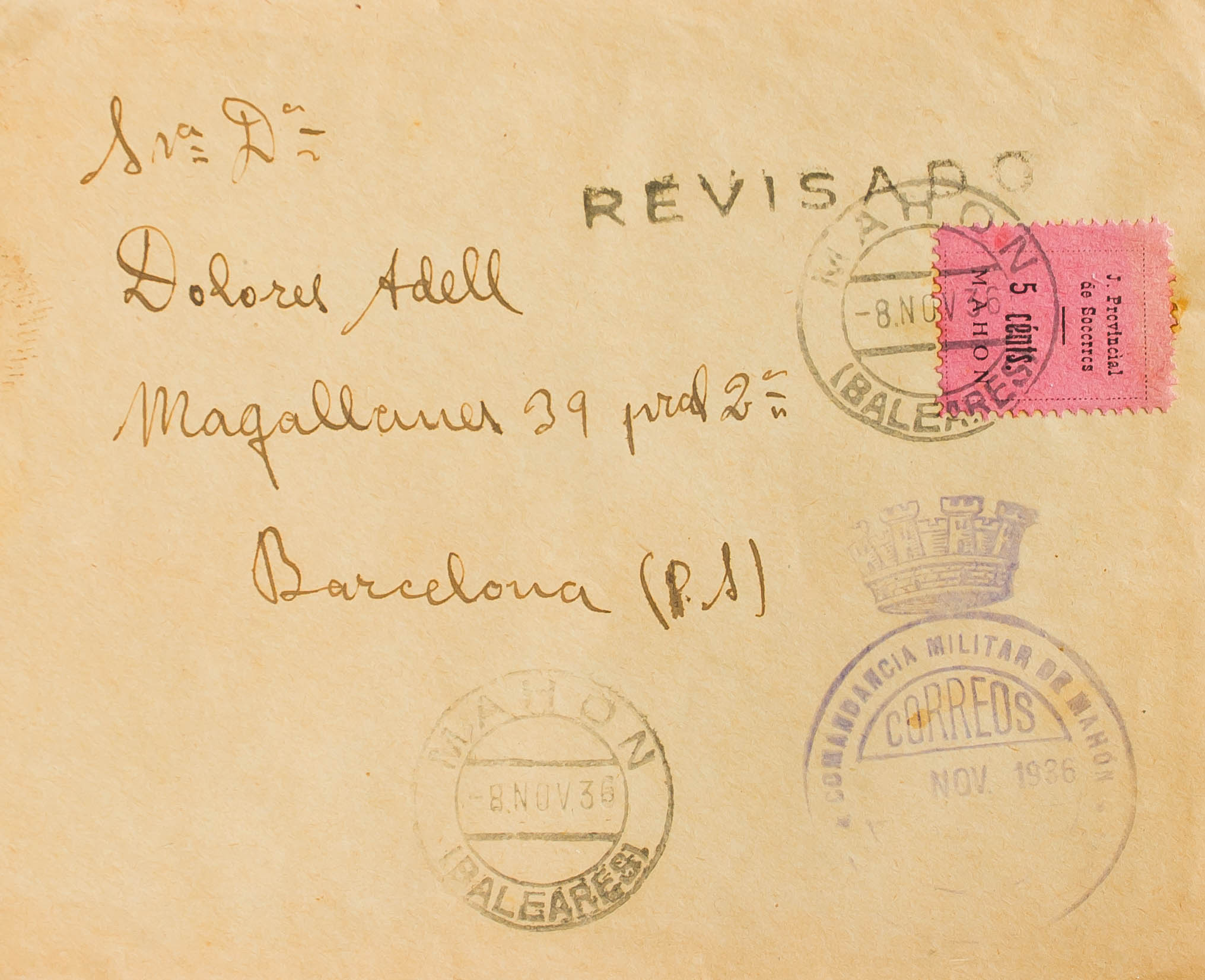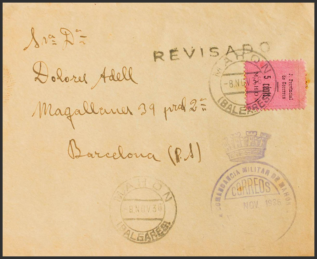 1936. 5 cts rosa (Tipo V) Local de JUNTA PROVINCIAL DE SOCORROS / MAHON (variedad "SOCCRRCS") MAHON a BARCELONA. En el frente marca de Franquicia COMANDANCIA MILITAR DE MAHON. MAGNIFICA Y MUY RARA. (Fesofi 4d).