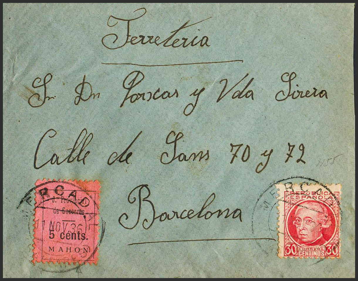 687. 1936. 30 cts carmÃn y 5 cts rosa (Tipo I) Local JUNTA PROVINCIAL DE SOCORROS / MAHON. MERCADAL a BARCELONA. MAGNIFICA Y MUY RARA. (Fesofi 4)