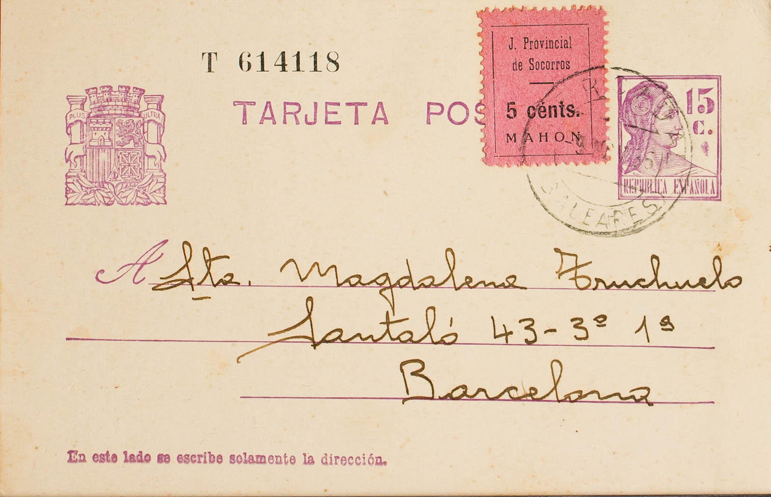 EP69. 1936. 15 cts sobre Tarjeta Entero Postal y 5 cts rosa (Tipo I) Local de JUNTA PROVINCIAL DE SOCORROS / MAHON. MERCADAL a BARCELONA. MAGNIFICA Y MUY RARA. (Fesofi 4)