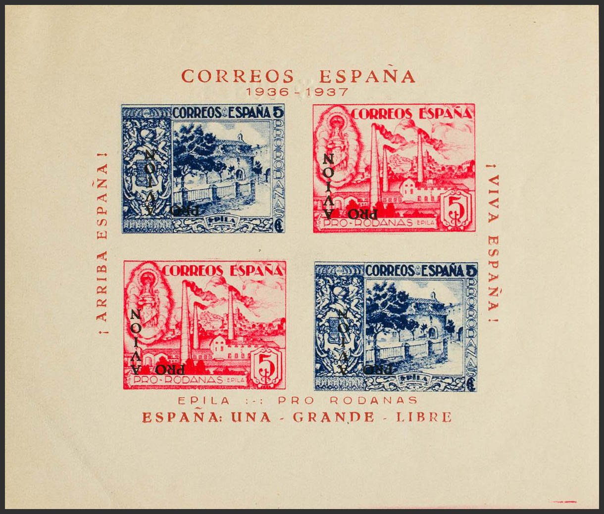 ★★1937. Hoja bloque EPILA 5 cts azul + 5 cts rosa PRO AVION, en negro. SOBRECARGA INVERTIDA. MAGNIFICA Y RARA. (Fesofi 11i)