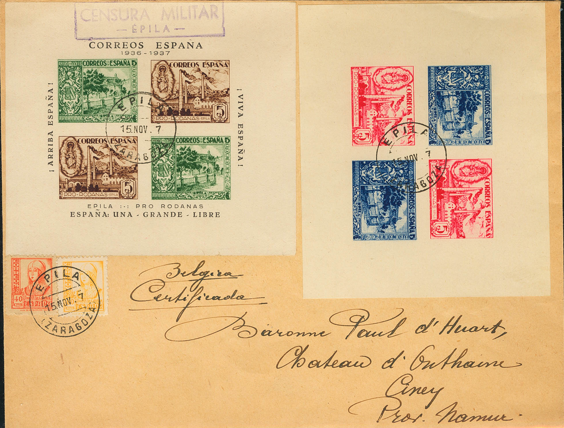 824, 826. 1937. Hojas bloque EPILA 5 cts castaño + 5 cts verde y 5 cts azul + 5 cts rosa (sin leyendas), 40 cts naranja, 60 cts amarillo. EPILA a CINEY (BELGICA). MAGNIFICA Y EXTRAORDINARIAMENTE RARAS CIRCULADAS CONJUNTAMENTE. (Fesofi 5, 8)