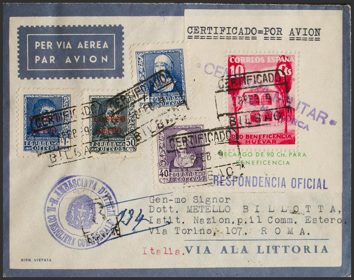 845/46, 858, 860. 1939. Serie completa, 40 cts violeta, 1 pts azul y hojita bloque de 10 cts de Pro Beneficiencia Huévar. Sobre del Ala Littoria Certificado de BILBAO a ROMA (ITALIA). Al dorso llegada. MAGNIFICA Y MUY RARA.