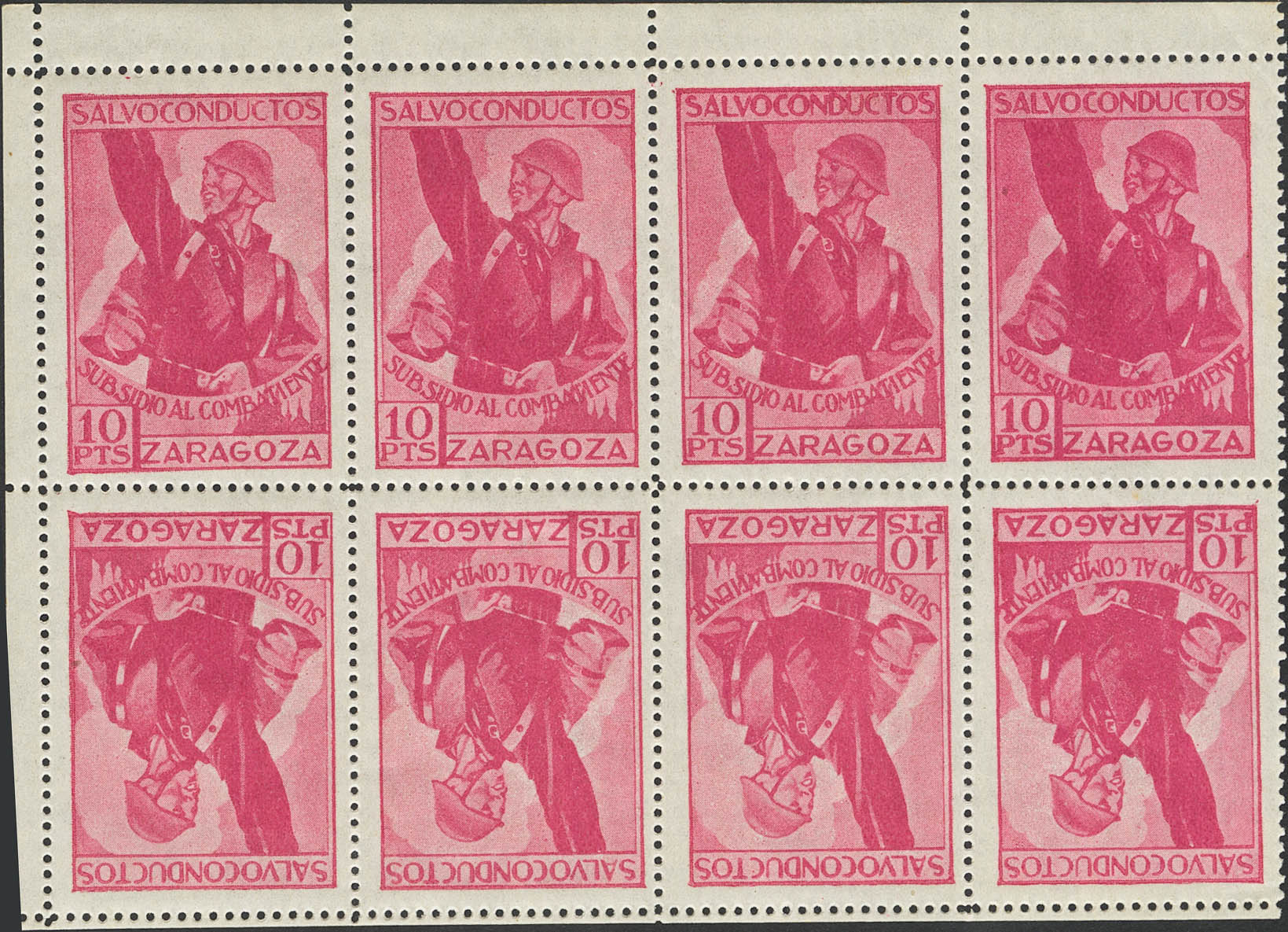 ★★1937. 10 pts rosa, bloque de ocho TETE BECHE. ZARAGOZA. MAGNIFICO Y RARO. (Fesofi 34 pvc, Allepuz 58)