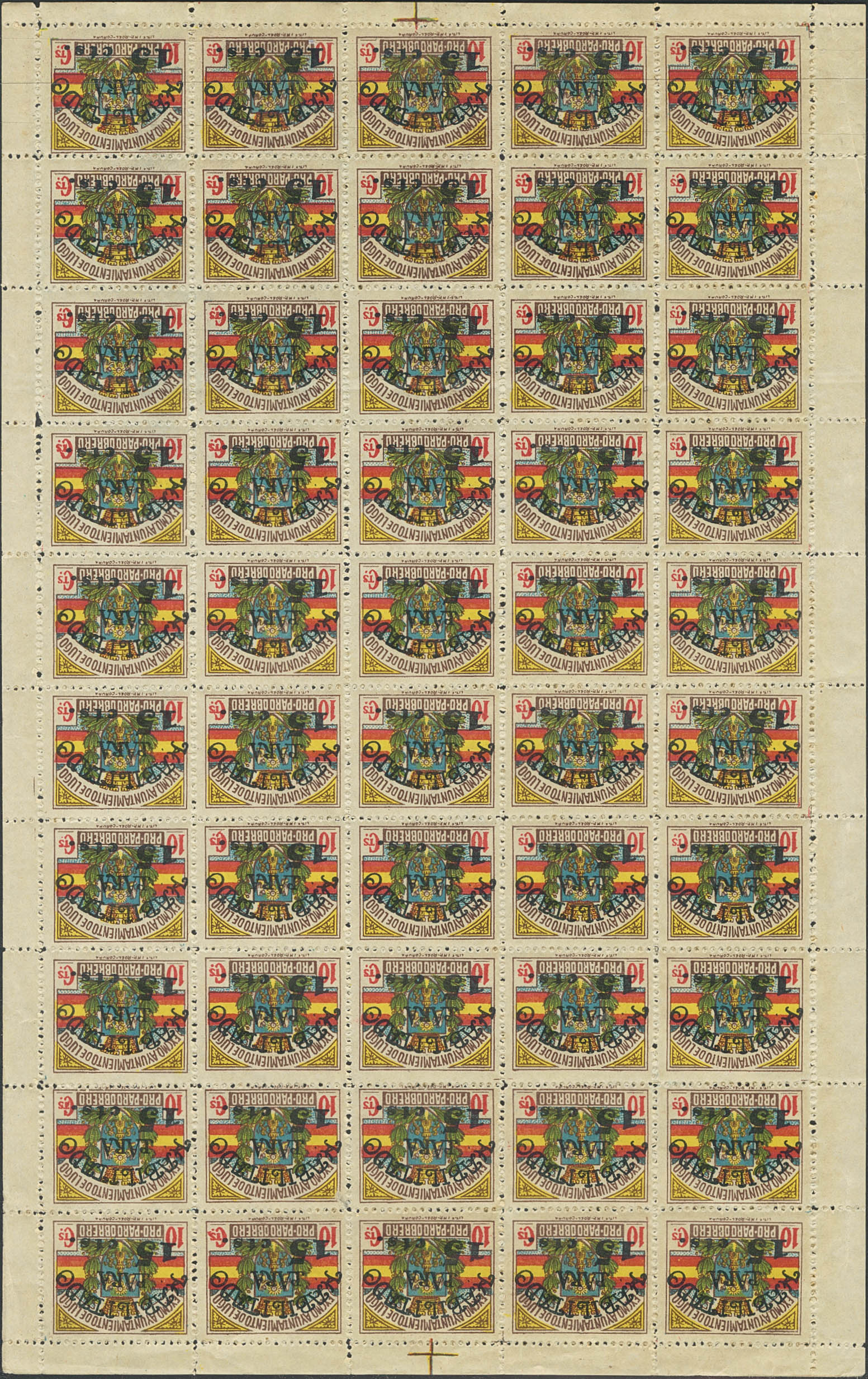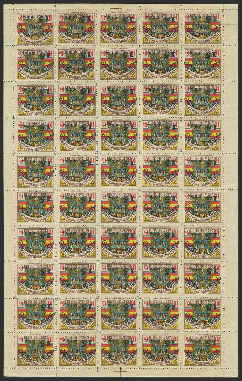 ★★1937. 15 cts sobre 10 cts multicolor, pliego de cincuenta sellos. LUGO. MAGNIFICO Y RARO. (Allepuz 25)