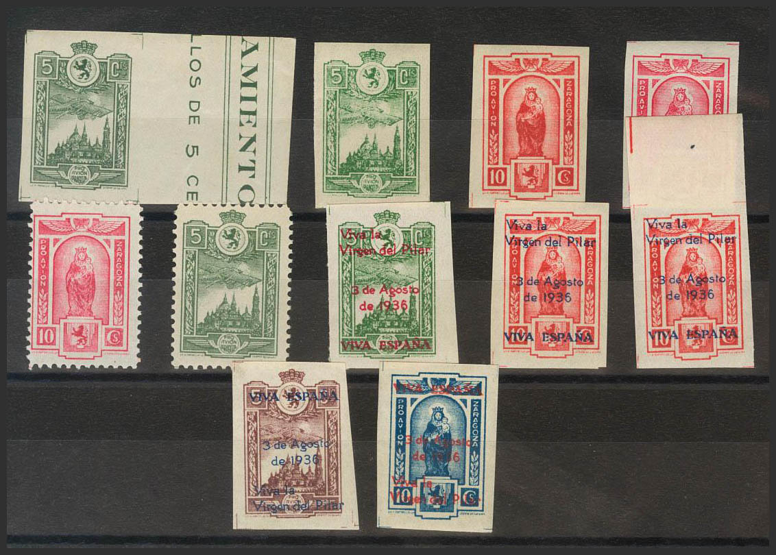 ★★/★1936. Espectacular conjunto de los sellos Locales Benéficos de la Virgen del Pilar de Zaragoza, incluyendo los dentados y sin dentar. A EXAMINAR.