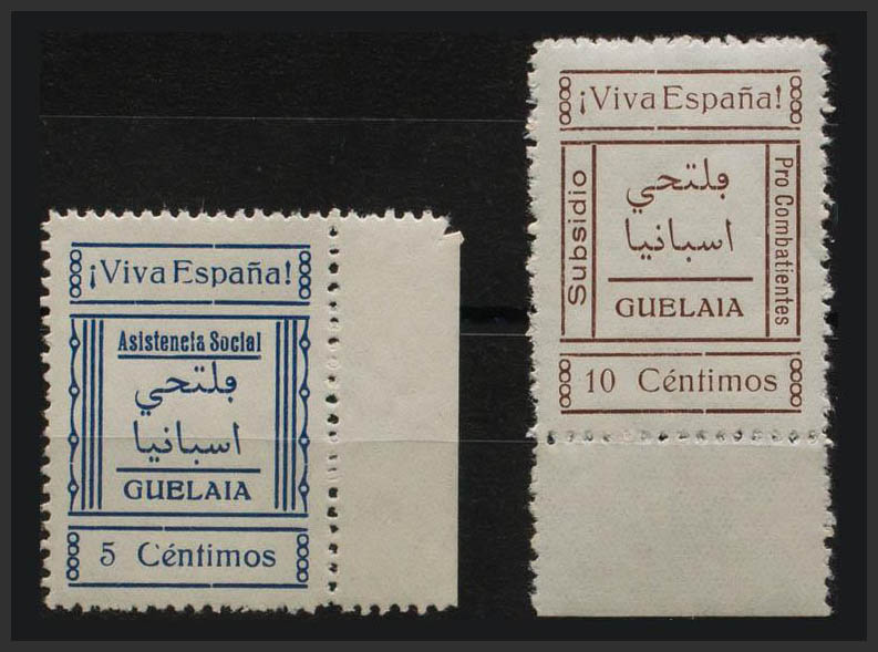 ★1937. 5 cts azul GUELAIA ASISTENCIA SOCIAL y 10 cts castaño GUELAIA SUBSIDIO PRO-COMBATIENTES. MAGNIFICOS. (Allepuz 1, 3)