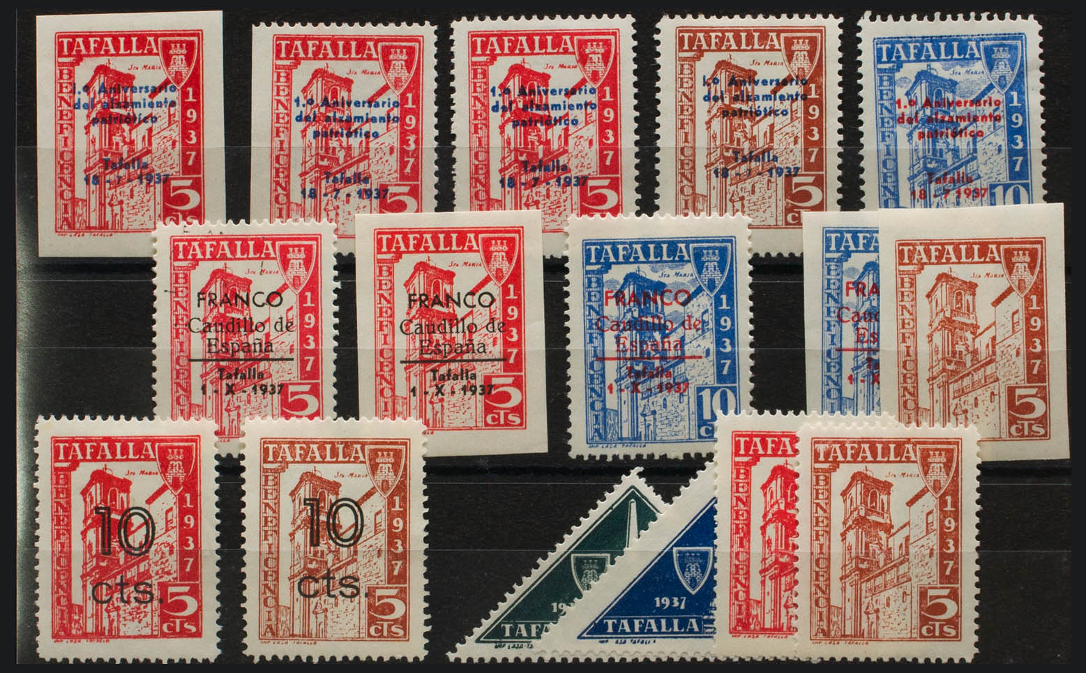 ★(1936ca). Espectacular conjunto de sellos Locales Benéficos de Tafalla, dentados y sin dentar y algunos sobrecargados (probablemente estén todos los conocidos). A EXAMINAR.