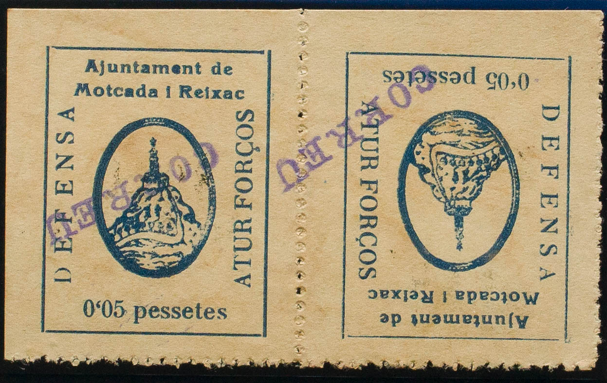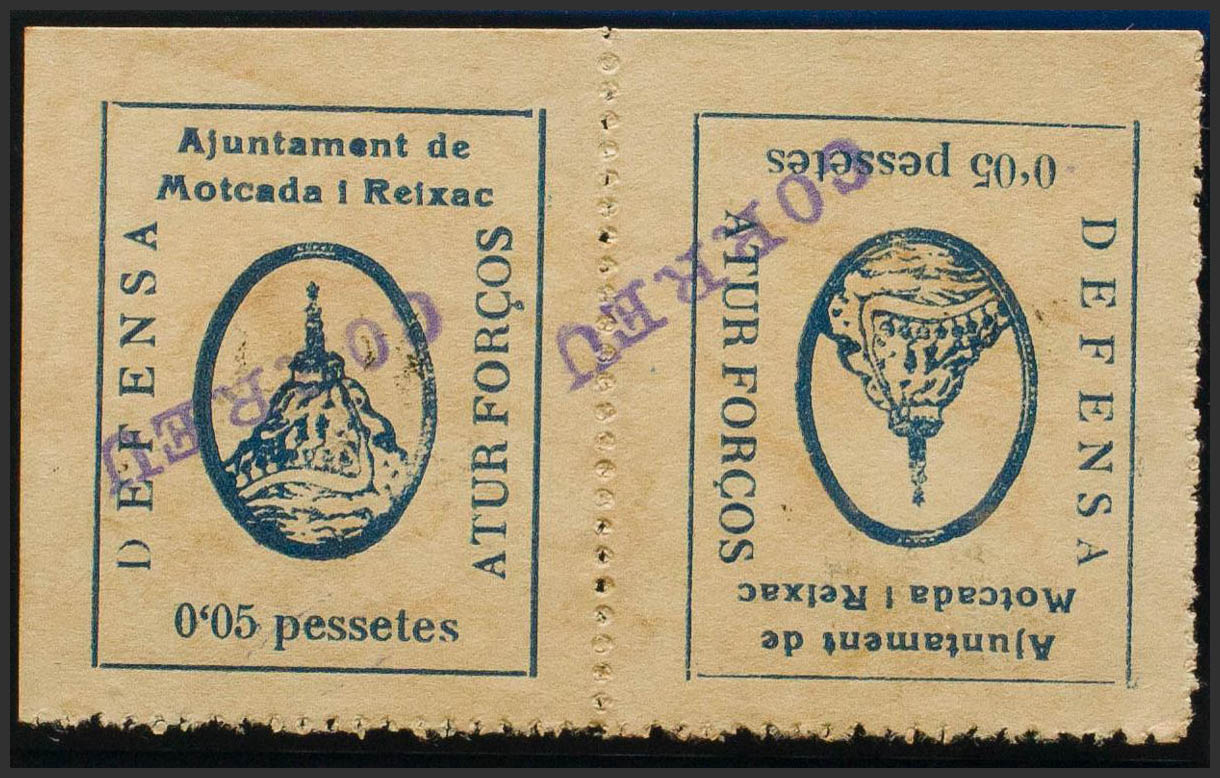 1937. 5 cts azul, pareja CAPICUA, UN SELLO SOBRECARGA INVERTIDA (conservación habitual). MONTCADA Y REIXAC (BARCELONA). BONITA Y RARA. (Fesofi 8a, 8b y Allepuz 18)