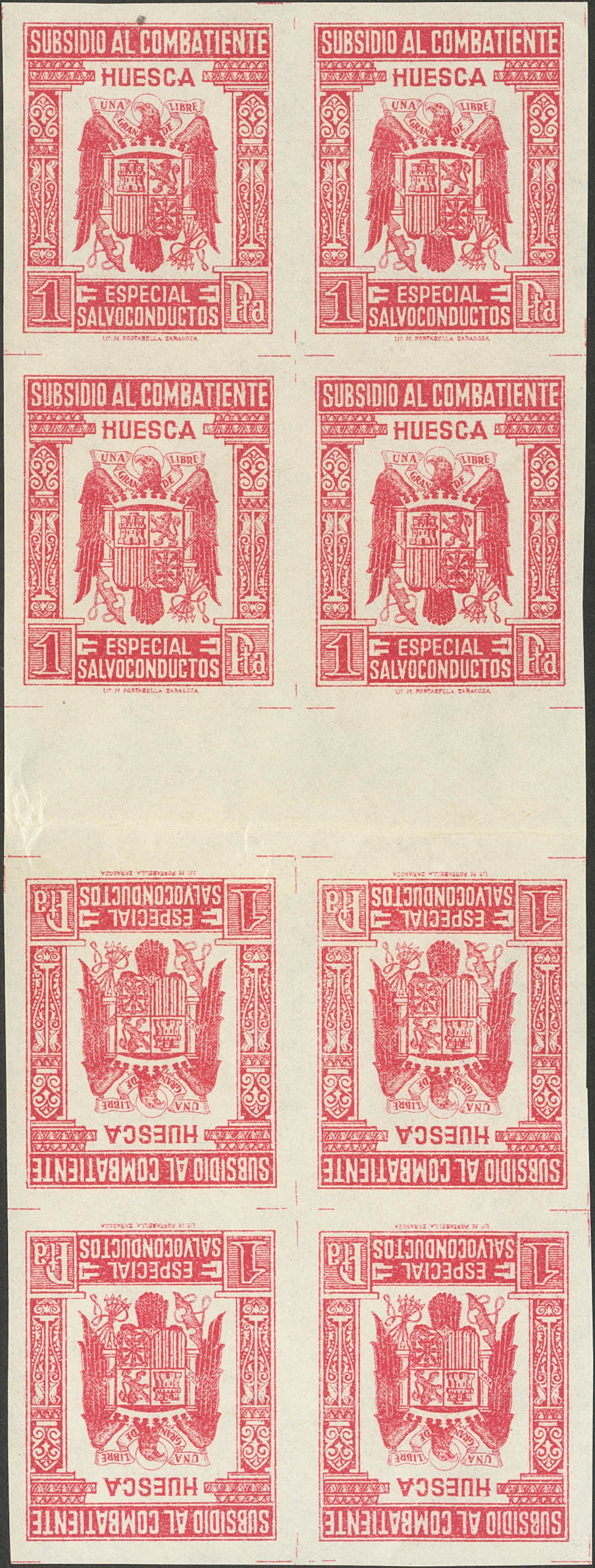 (★)1940. 1 pts rosa carmín (sin dentar), bloque de ocho, con interpanel capicúa. HUESCA. MAGNIFICO Y MUY RARO. (Allepuz 20sha)