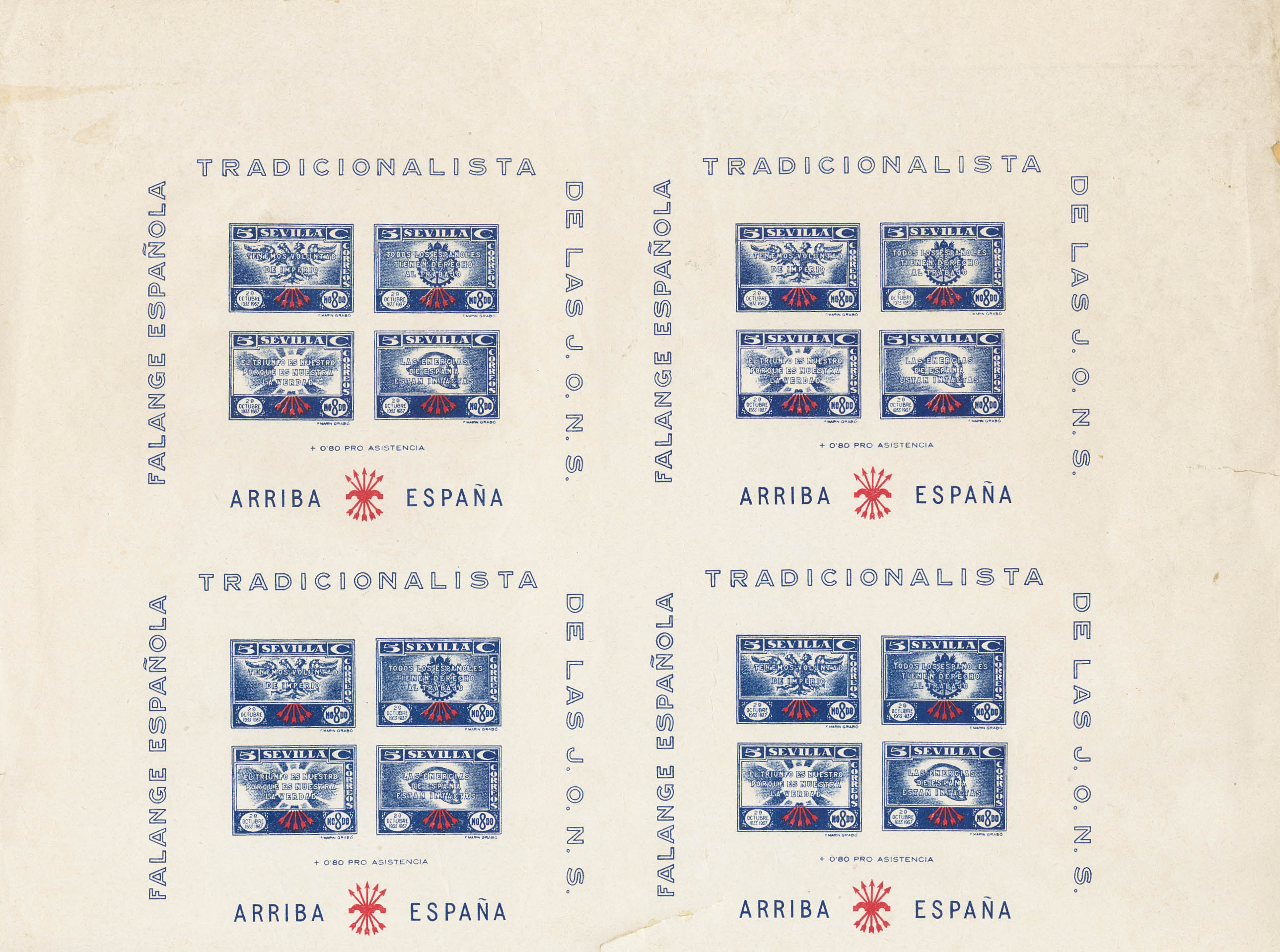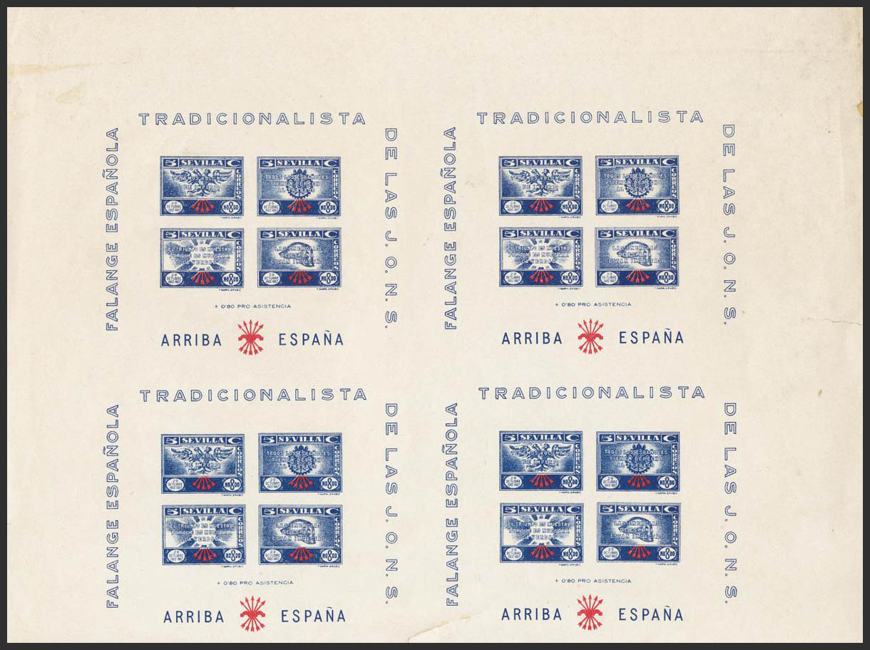 ★★/(★)1937. Espectacular conjunto de hojas bloque de Sevilla de Falange, de los valores de 5 cts azul y 5 cts violeta oscuro, en bloques de cuatro y bloques de ocho (sin cortar), sobre papel blanco y papel crema, algunas con variedades de FLECHAS DESPLAZADAS o DOBLE IMPRESION (las piezas se doblaron para su conservación y tienen alguna erosión o corte). MAGNIFICO Y EXTRAORDINARIAMENTE RARO CONJUNTO.