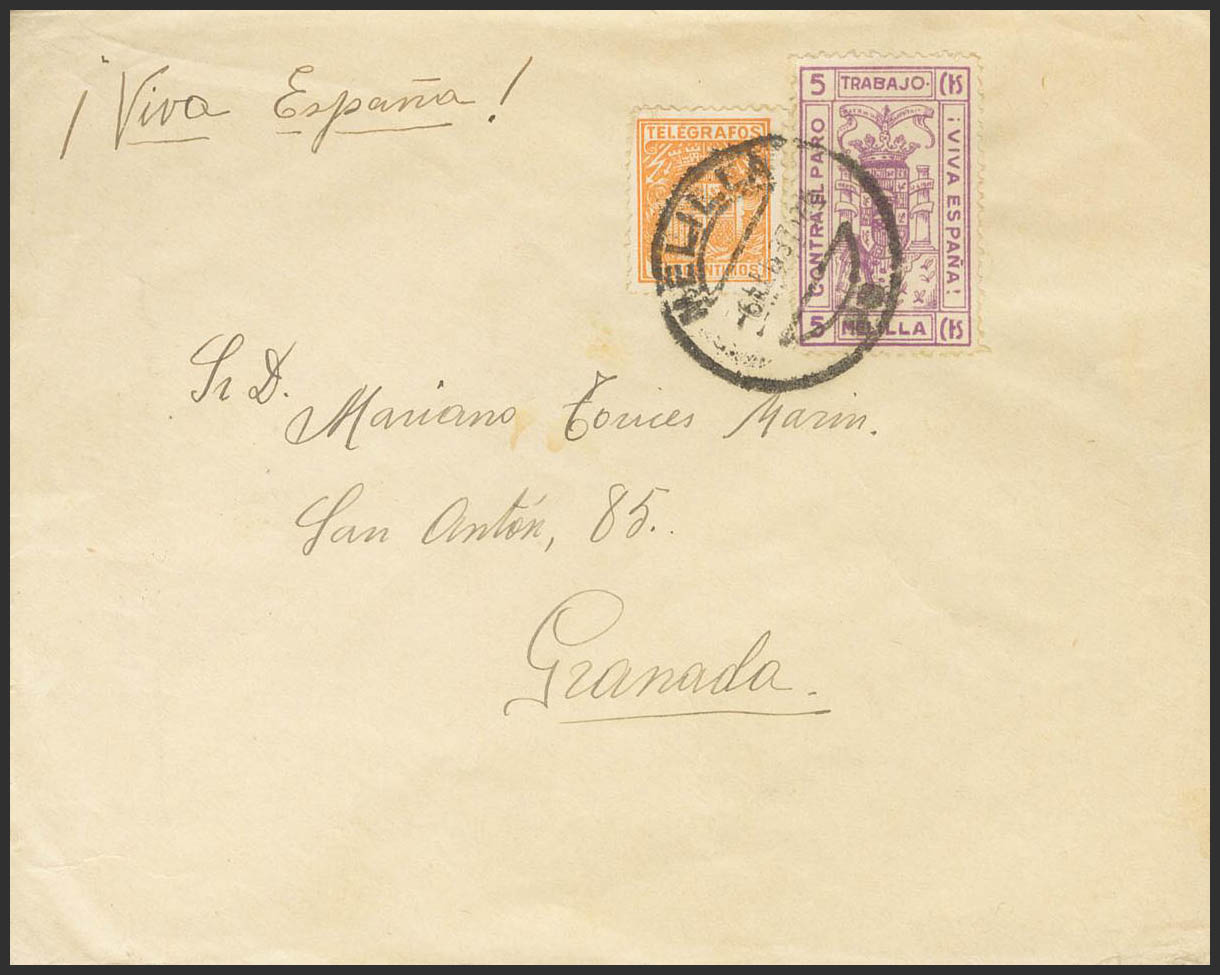 1937. 5 cts lila CONTRA EL PARO y 30 cts naranja de Telégrafos. MELILLA a GRANADA. Al dorso llegada. MAGNIFICA Y RARA. (Allepuz 1)