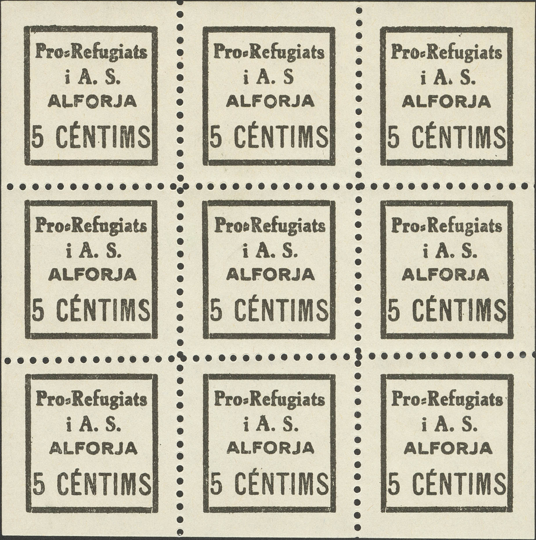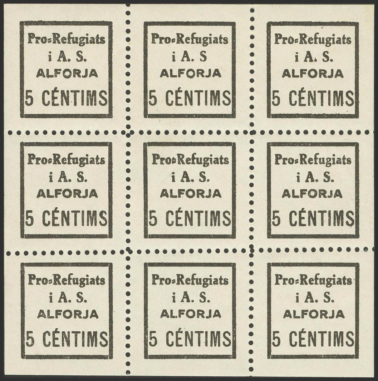 ★★1937. 5 cts negro ALFORJA (TARRAGONA), hoja completa de nueve sellos, conteniendo las tres variedades conocidas. MAGNIFICA. (Allepuz 1, 1a/c, Fesofi 1, 1a/c)