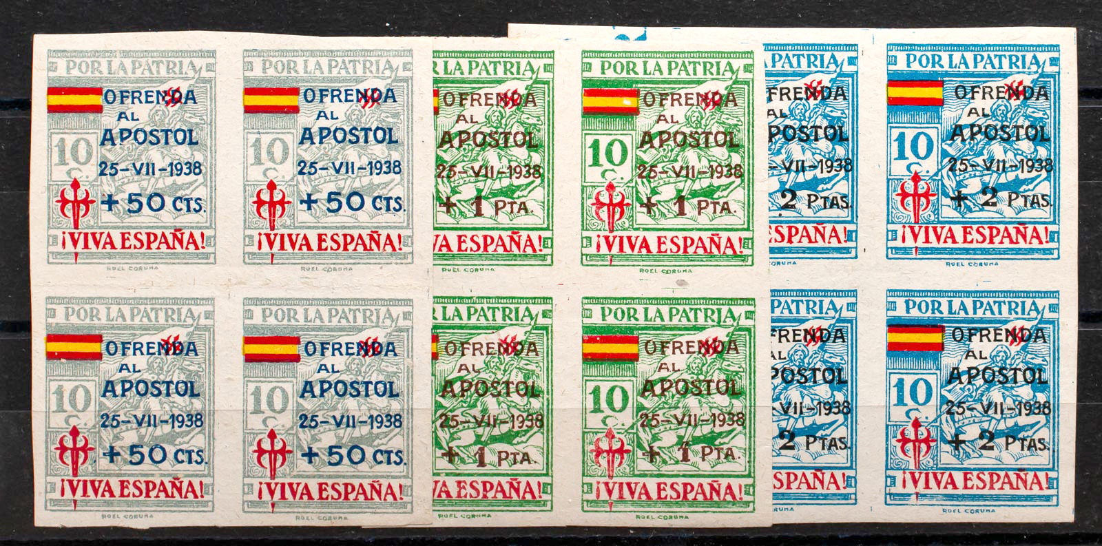 ★/(★)1938. Serie completa (sin dentar), tres valores, bloques de cuatro. LA CORUÑA (GALICIA) OFRENDA AL APOSTOL SANTIAGO. MAGNIFICA Y RARA. (Allepuz 7/9, Fesofi 13/15)