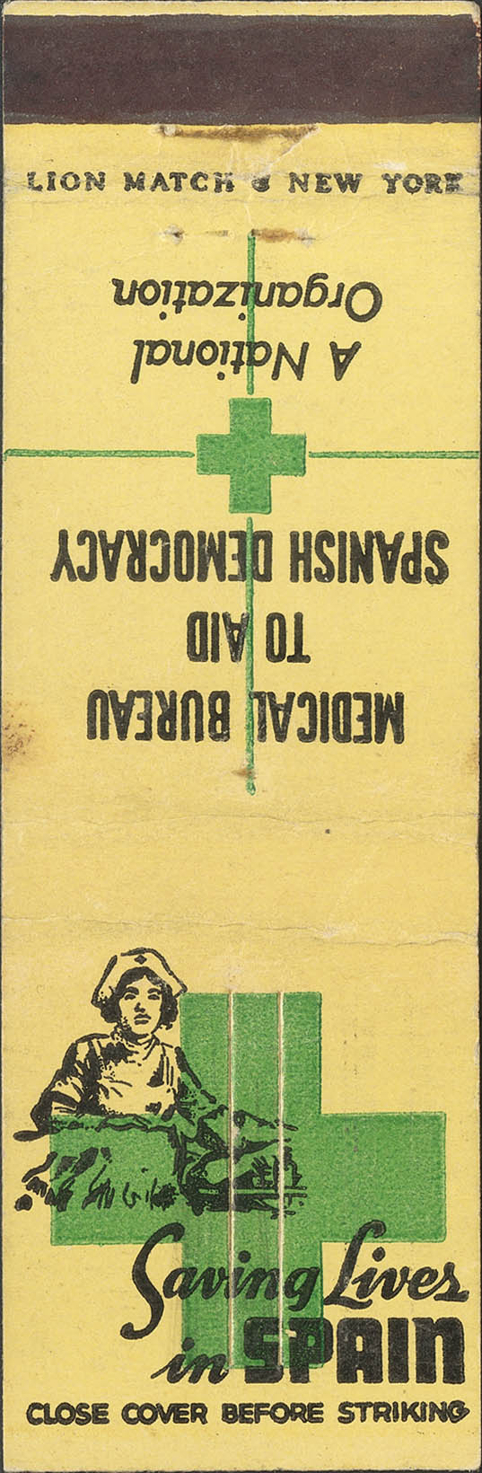 △(1936ca). Cajita de cerillas. MEDICAL BUREAU TO AID SPANISH DEMOCRACY, A NATIONAL ORGANIZATION, SAVING LIVES IN SPAIN, impresa en Nueva York para recaudar fondos para los hospitales americanos en España durante la Guerra Civil. MAGNIFICA Y MUY RARA.