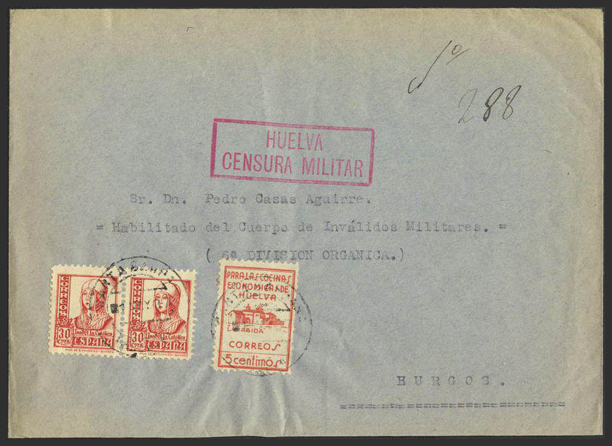 823(2). 1937. 30 cts, pareja y 5 cts sello local HUELVA. SANTA BARBARA a BURGOS. MAGNIFICA.