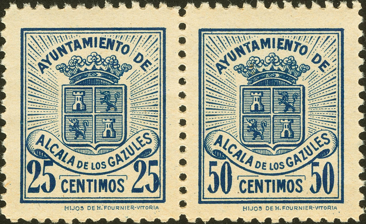 ★★1938. 25 cts azul y 50 cts azul, unidos en pareja. ALCALA DE LOS GAZULES (CADIZ). MAGNIFICOS Y RAROS EN PAREJA.