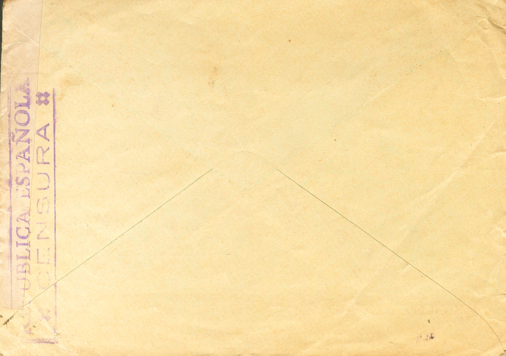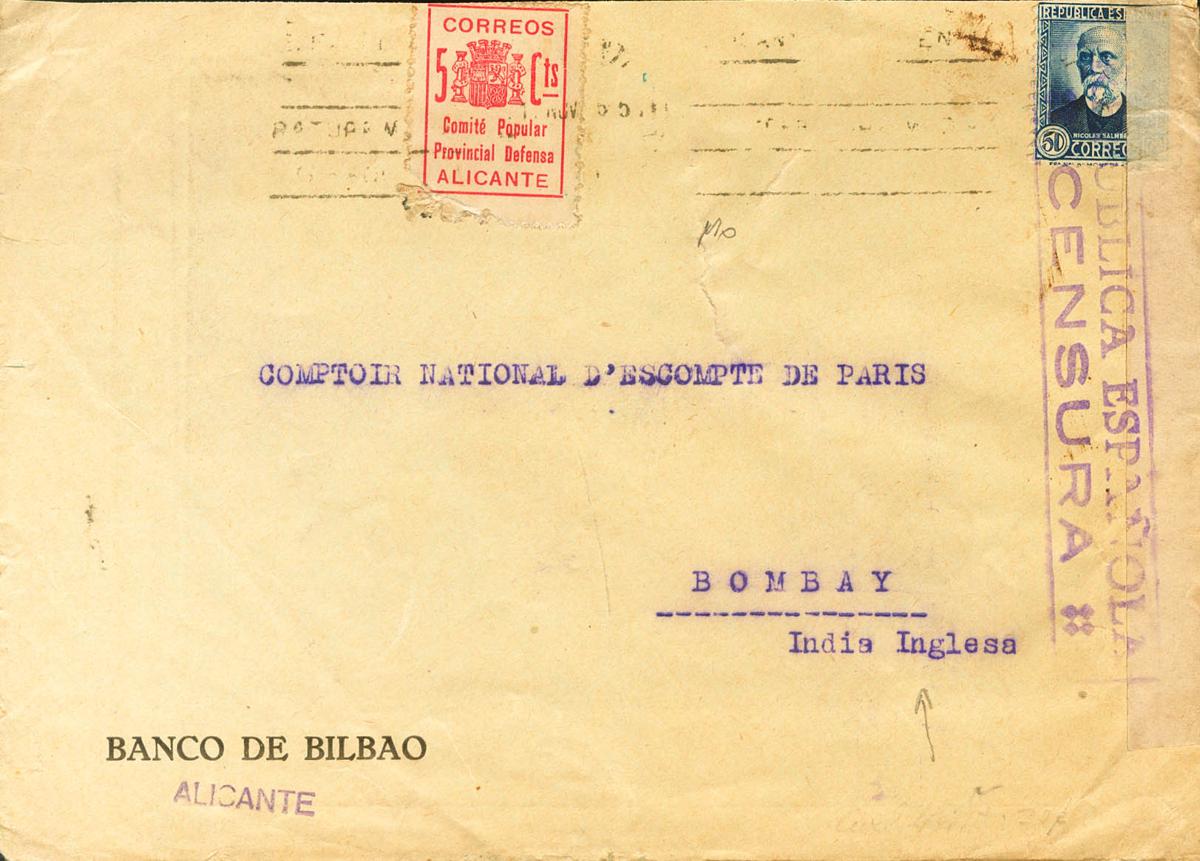 688. 1936. 50 cts azul y local de Alicante de 5 cts rosa. ALICANTE a BOMBAY (INDIA BRITANICA). MAGNIFICA Y RARO DESTINO.