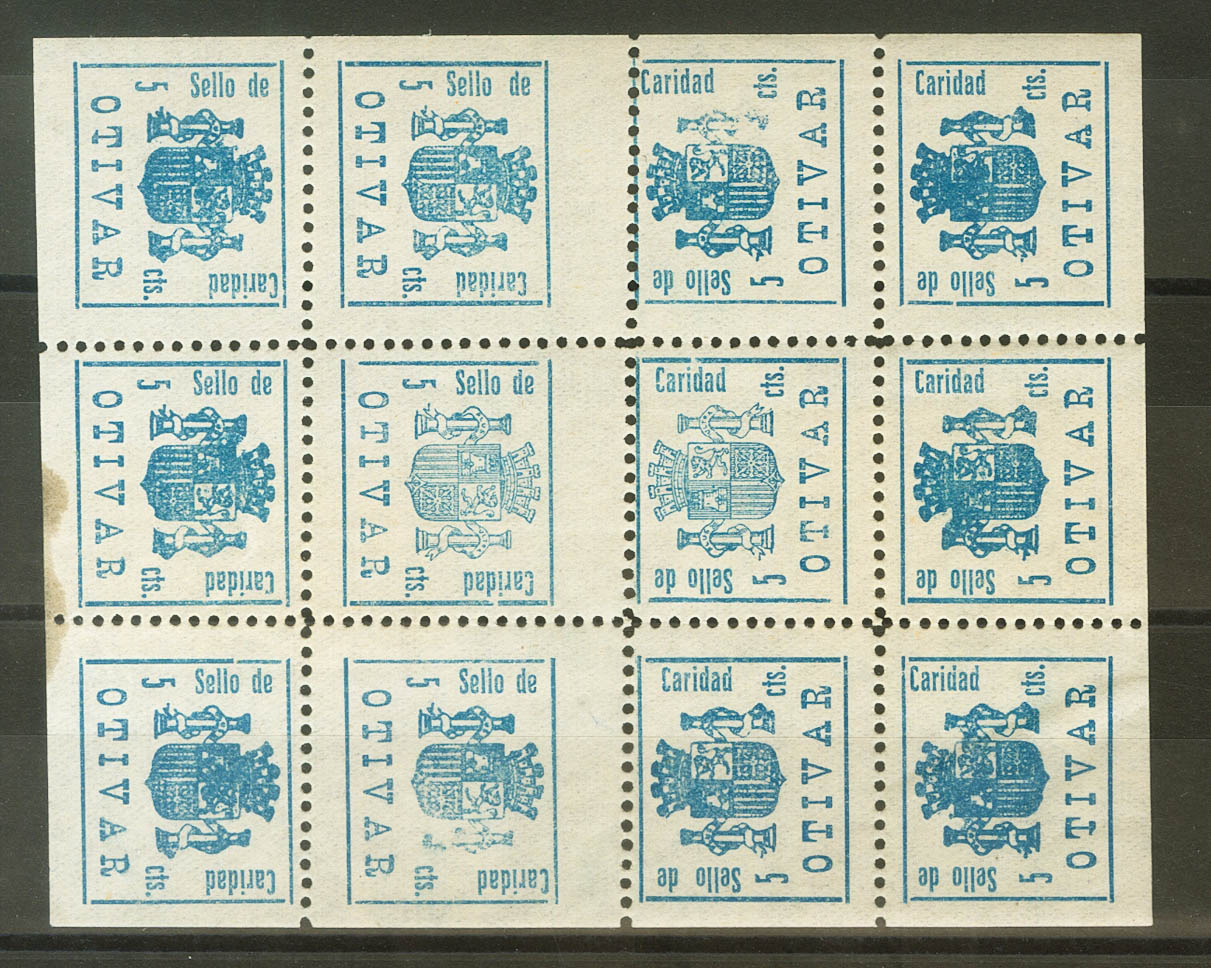 ★★/★1938. 5 cts azul, minihoja de ocho sellos (sellos centrales capicúas). OTIVAR (GRANADA). BONITA. (Allepuz 1, 1sii, FEsofi 1, 1 pvc)