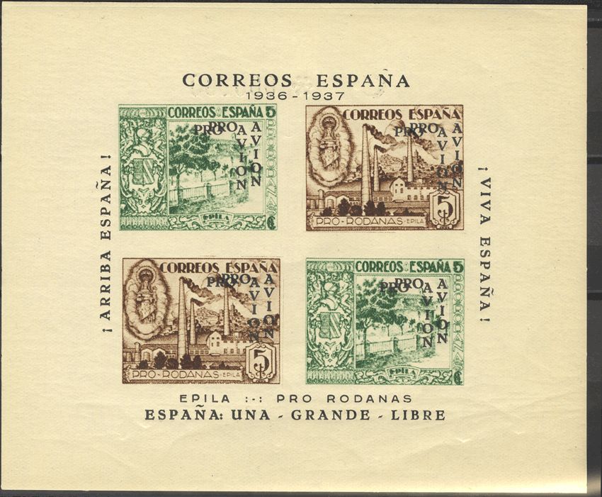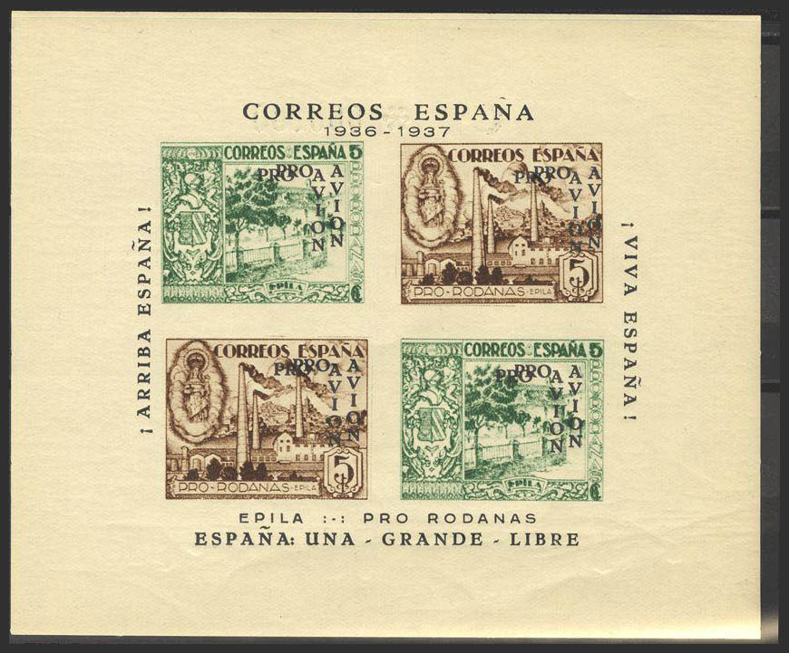 ★(1936ca). 5 cts, dos hojas bloques. EPILA. Sobrecarga doble POR AVION, en negro. MAGNIFICAS Y RARAS. (Fesofi 9sd, 11sd)
