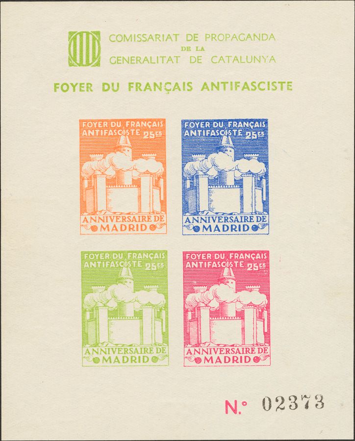 ★(1936ca). Hoja bloque, SIN DENTAR. FOYER DU FRANCAIS ANTIFASCISTE. MAGNIFICA Y MUY RARA. (Guillamón 2270).