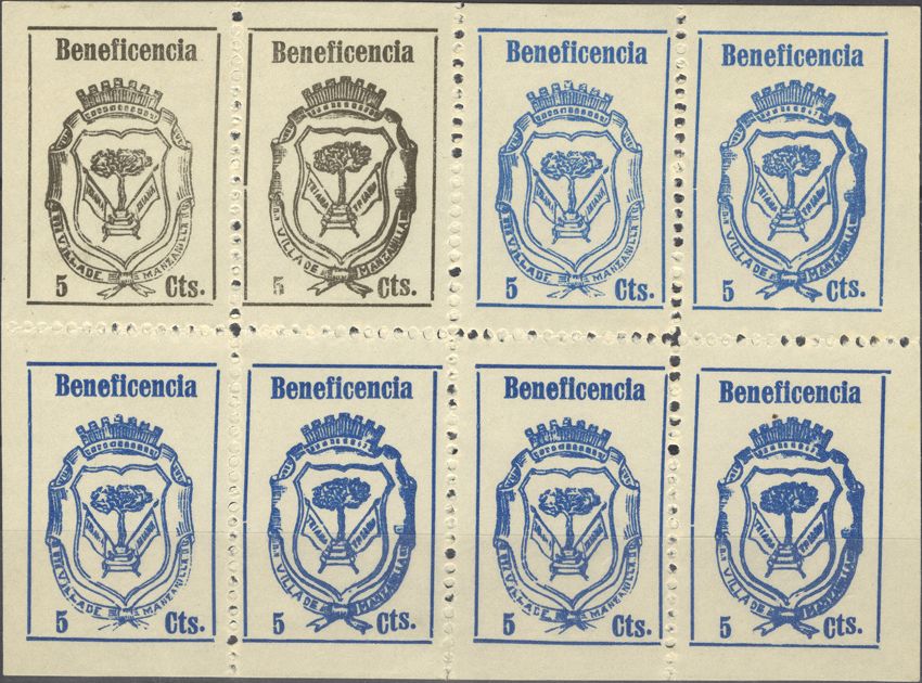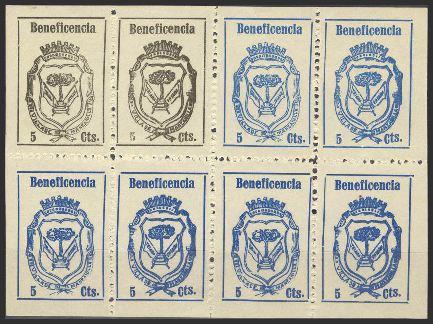 ★(1936ca). 5 cts, bloque de ocho, dos sellos en negro y seis en azul, incluyendo las variedades correspondientes. MANZANILLA. MAGNIFICO. (Fesofi 4, 4a, 5, 5a).