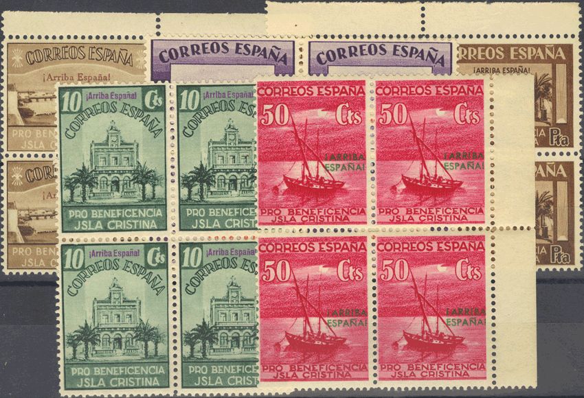 ★(1936ca). Serie completa, en bloque de cuatro. ISLA CRISTINA. Sobrecarga ARRIBA / ESPAÑA. MAGNIFICA. (Fesofi 18/22(4)).